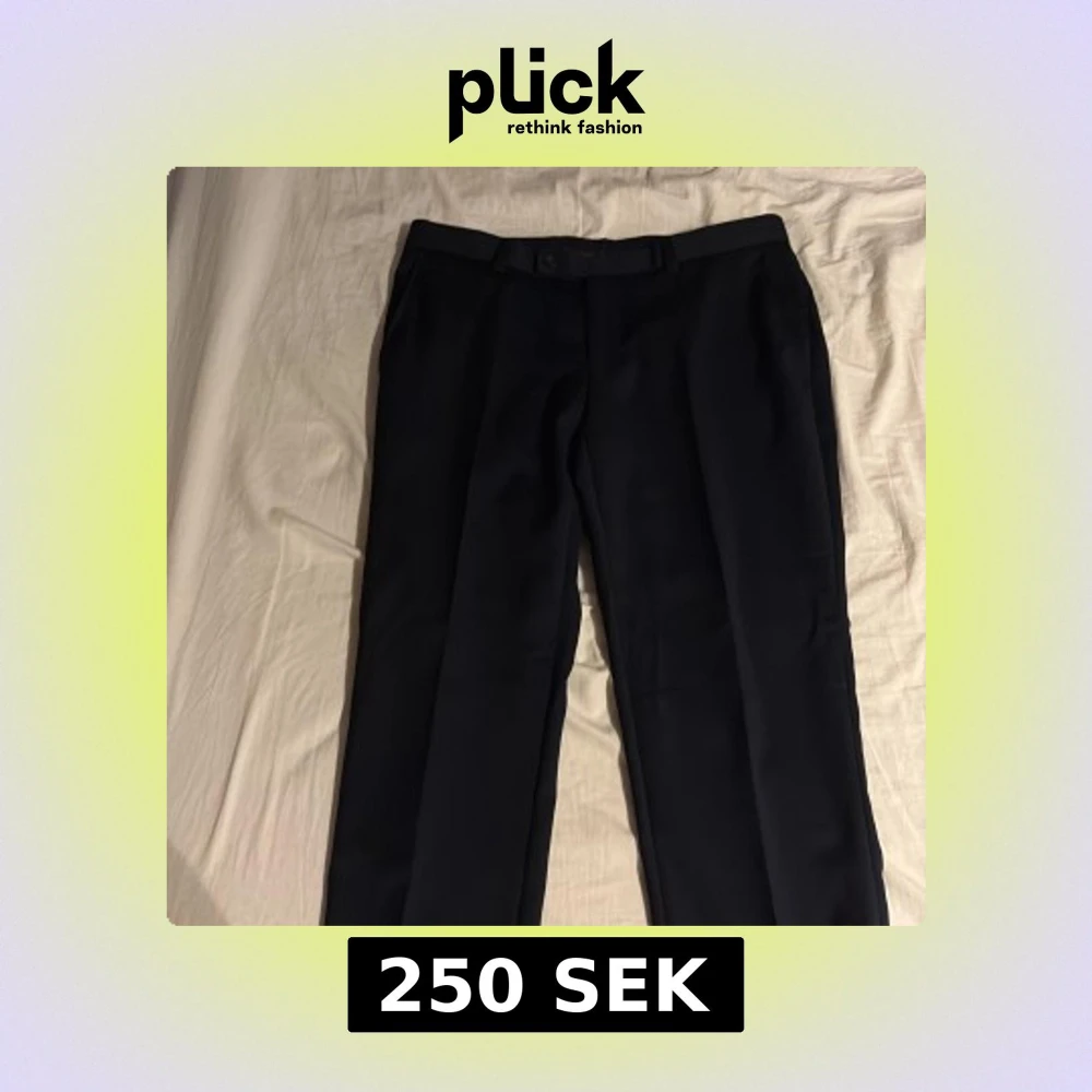 Säljer ett par mörkblå kostymbyxor från Dressmann i slim fit-modell. Byxorna har raka ben, bälteshällor och knäppning fram samt bakfickor med knapp. Perfekta för en stilren look. Byxorna är i storlek 32/32 och passar dej som är runt 180. Använda cirka 3 gånger. Hör av er vid frågor och funderingar