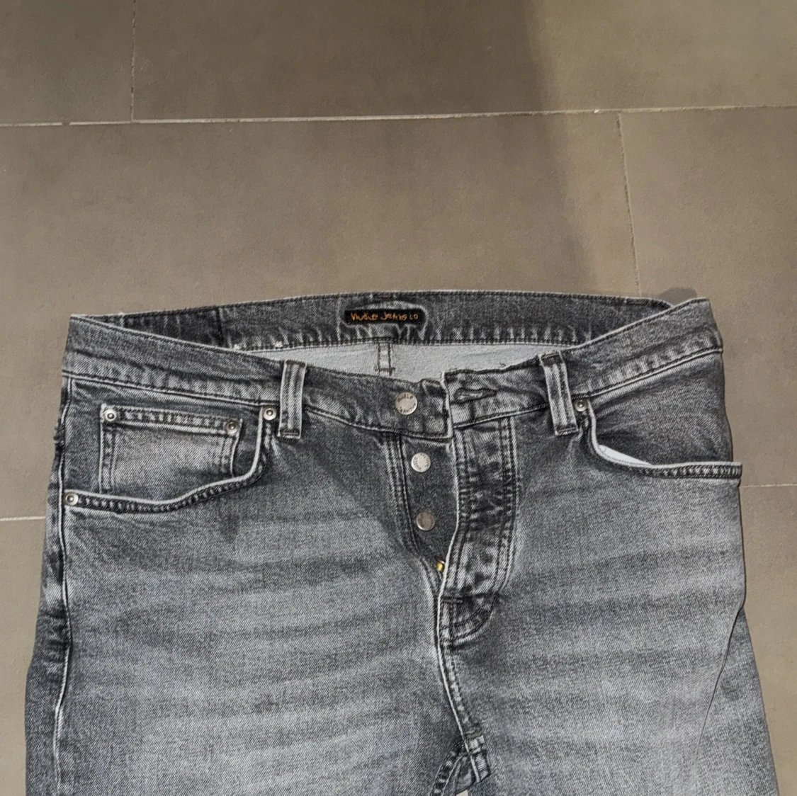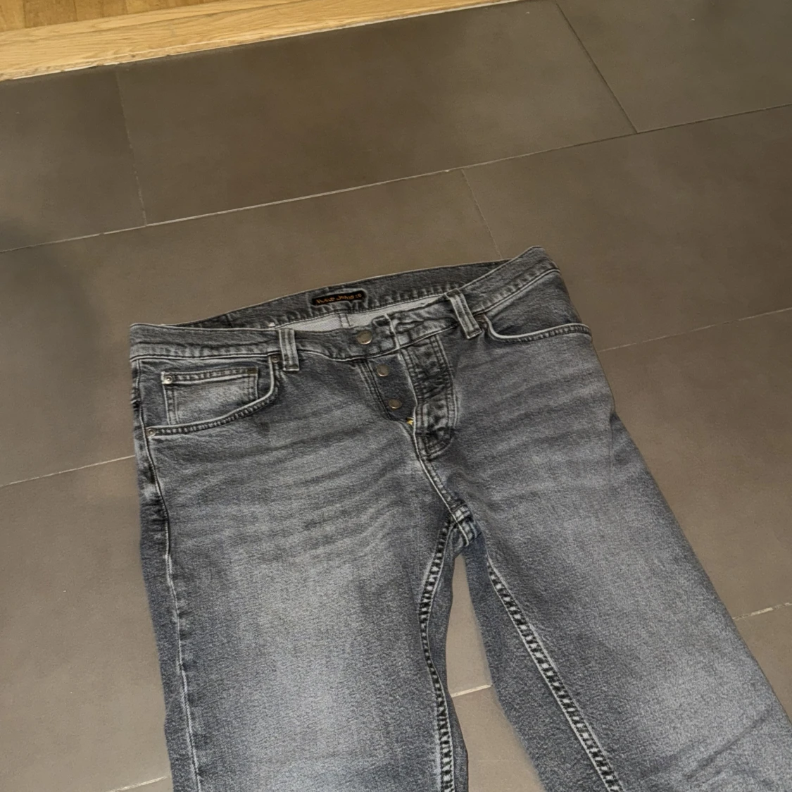 Snygga grå jeans från Nudie Jeans med en klassisk femficksdesign. De har en knappgylf och en diskret tvättad look som ger en cool stil. Perfekta för en avslappnad vardagslook.
