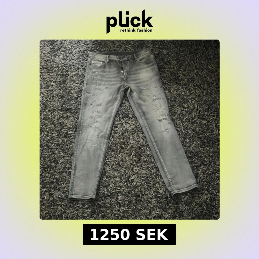 Säljer ett par grå jeans från Dsquared2 med coola slitningar och tvättad look. Byxorna har fem fickor, dragkedja och smal passform. Märkesdetalj bak med '1964'. Perfekta för dig som gillar streetstyle och vill sticka ut.