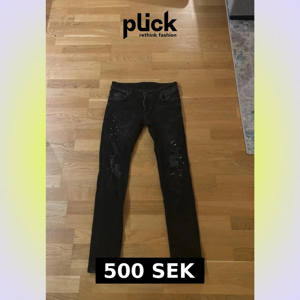 Svarta jeans från Dsquared2 med skinny/slim passform. Byxorna har slitningar och små färgstänk på framsidan för en edgy look. Klassisk femficksmodell med Dsquared2-logga vid gylfen och svart patch bak i midjan. Tillverkade i stretchig denim för extra komfort.