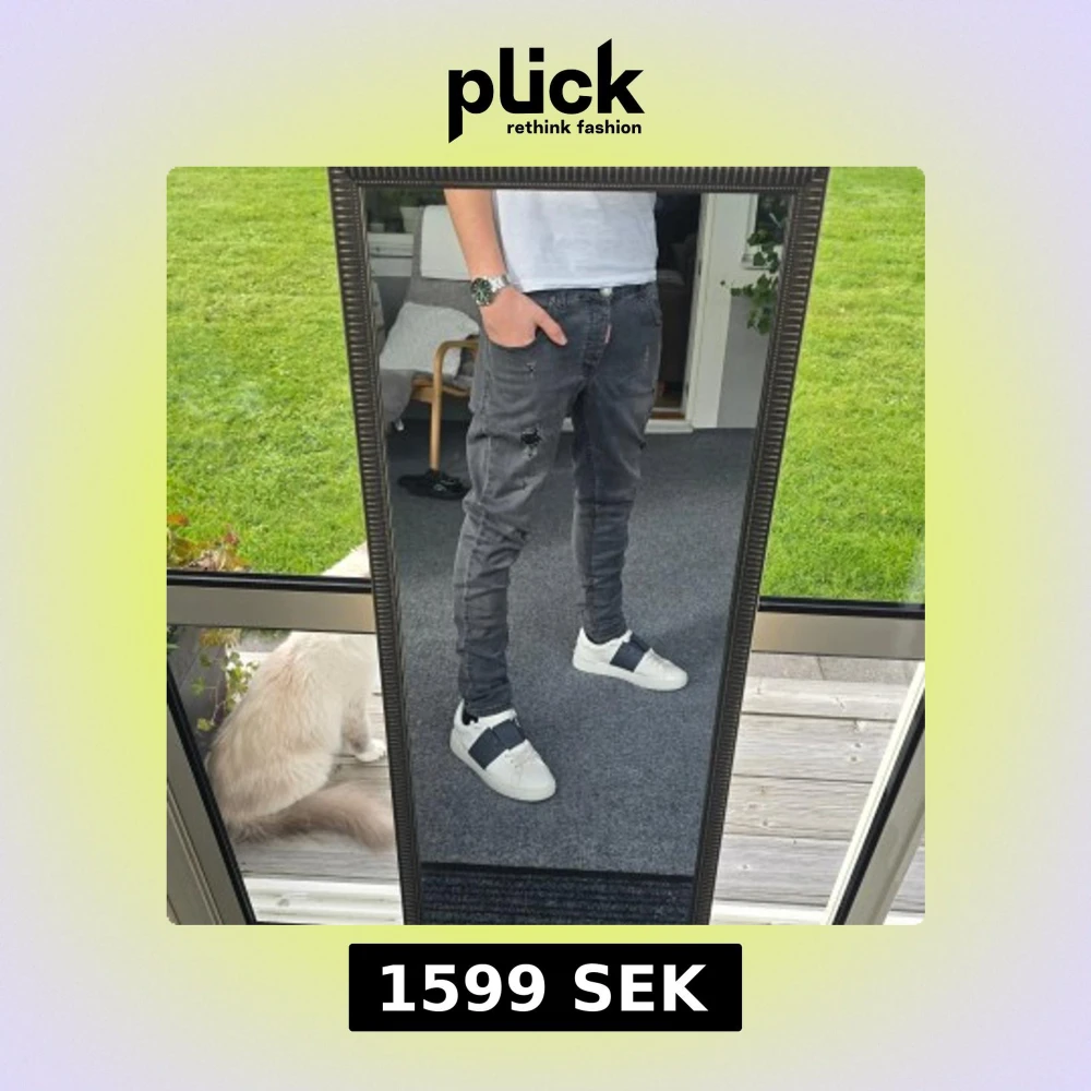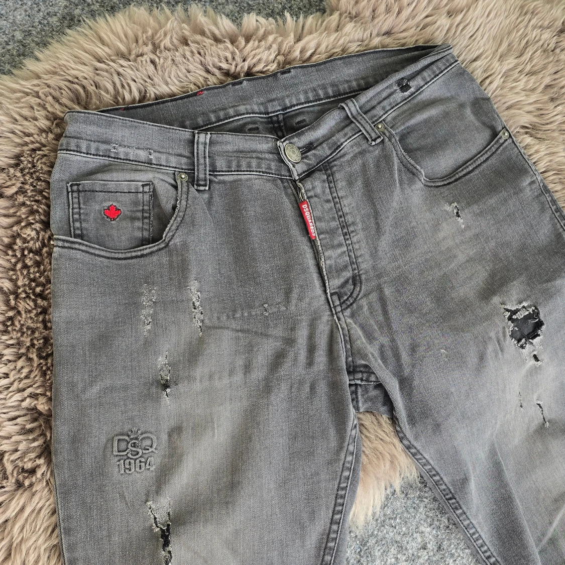 Gråa Dsquared2 jeans i storlek 32. Väldigt billigt pris om man jämför med vad de kostar nya. Observera att lappen bak har lossnat lite i ena hörnet, dock inget som syns när man har på sig dem! 🤩