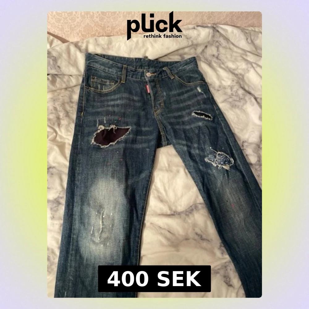 Säljer ett par blå Dsquared2 slim jeans i storlek 32 med coola slitningar, hål och färgstänk. Klassisk femficksmodell med läderpatch bak och snygga detaljer. Jeansen har en slim passform och är tillverkade i bomull. Perfekt för dig som gillar en edgy streetstil.