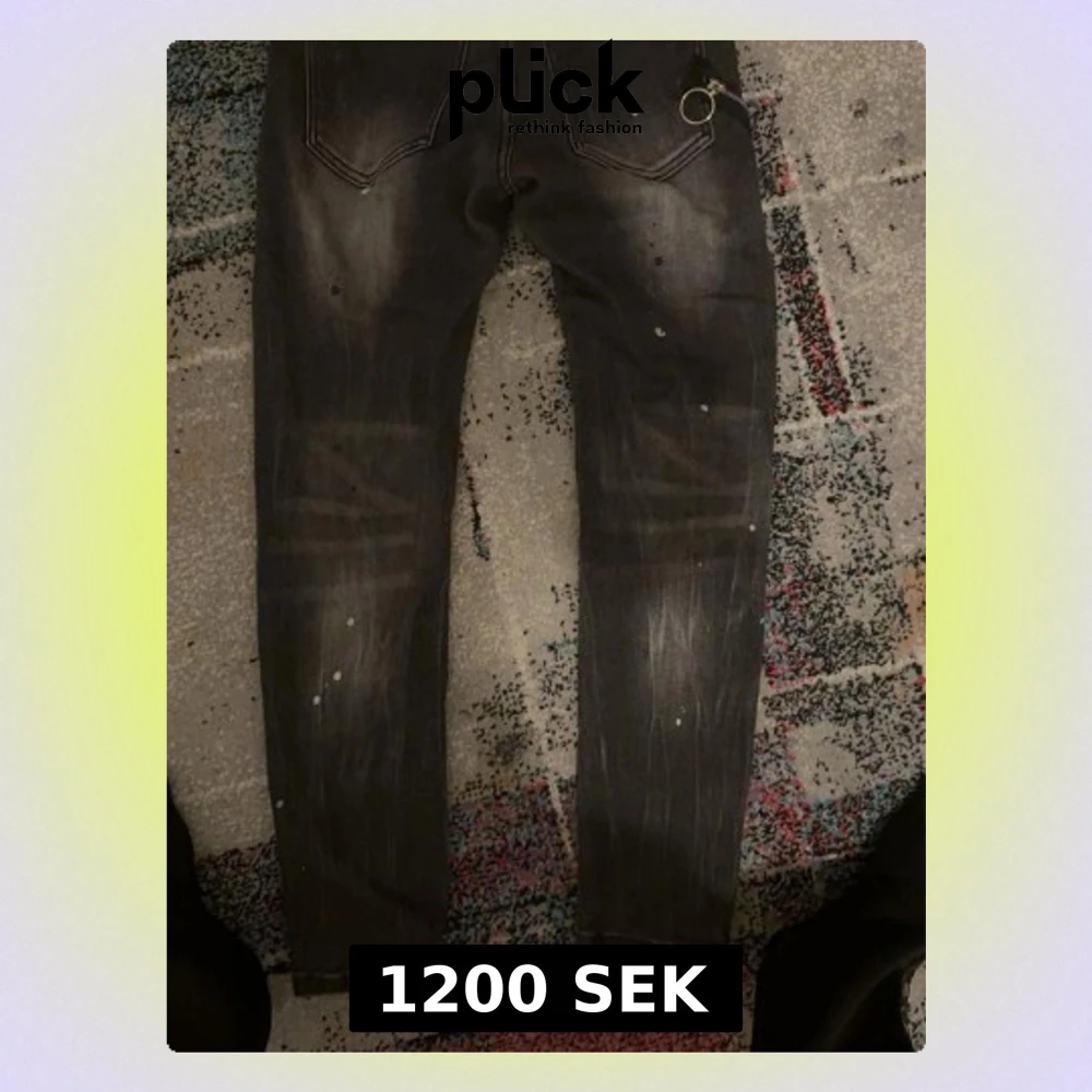 Säljer ett par svarta Dsquared2 ICON jeans med vit text framtill och coola slitningar samt färgstänk för en edgy look. Jeansen har smal passform och klassisk femficksdesign. Perfekta för dig som vill sticka ut med din stil.