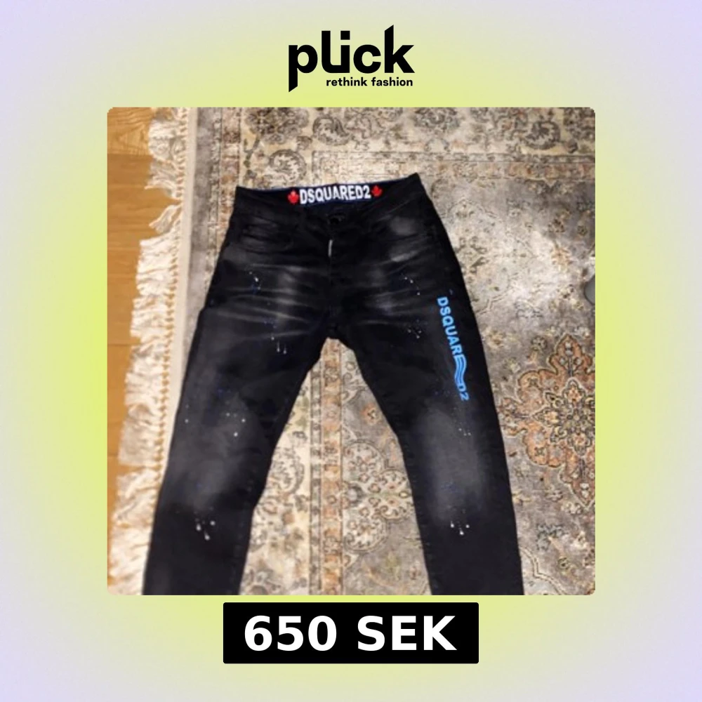 Säljer ett par svarta jeans från Dsquared2 med blå logotyptryck på benet och coola färgstänk. Skinny fit och klassisk femficksmodell. Snygg Dsquared2-patch baktill med röd lönnlöv. Perfekt för dig som gillar streetwear och detaljer. Använd 5-6 gånger passar längd mellan 170-180 cm.