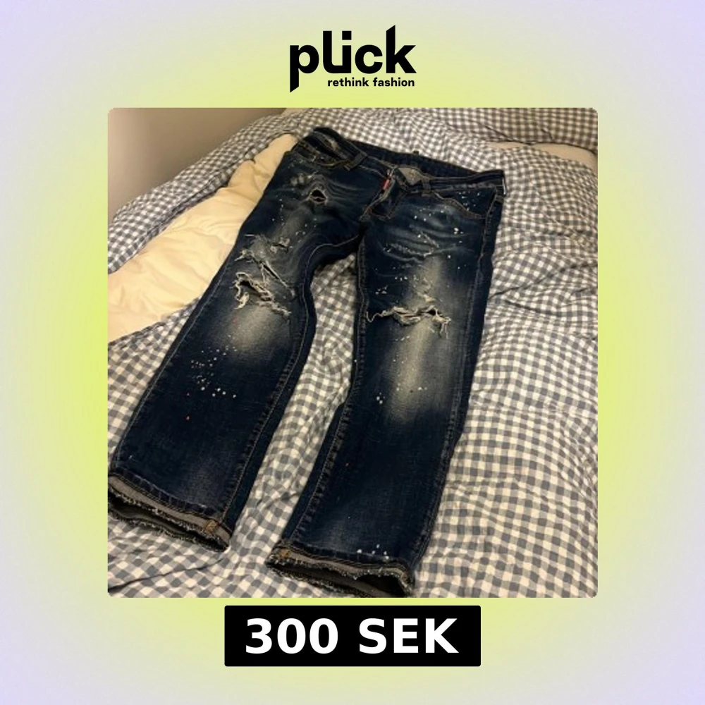 Säljer ett par blå jeans från Dsquared2 med slitna detaljer, färgstänk och patch på bakfickan. Jeansen har raka ben, klassisk femficksdesign och coolt tvättad look. Perfekta för dig som gillar streetstyle och unika plagg.