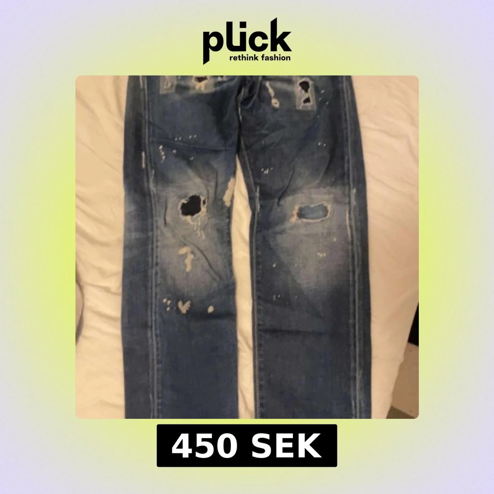 Säljer ett par blå jeans från Dsquared2 i storlek 42. Jeansen har flera stora och små hål, slitningar och en tvättad look som ger dem en riktigt edgy vibe. Klassisk femficksmodell med raka ben och grova detaljer. Perfekt för dig som gillar streetstyle.