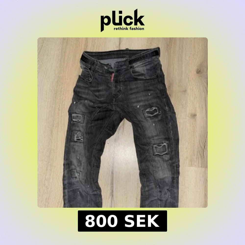 Säljer ett par svarta jeans från Dsquared2 med coola slitningar och färgstänk. Jeansen har skinny passform, detaljerade sömmar och trasiga partier på benen. Klassisk femficksmodell med Dsquared2-logga vid gylfen. Perfekta för en edgy streetstil.