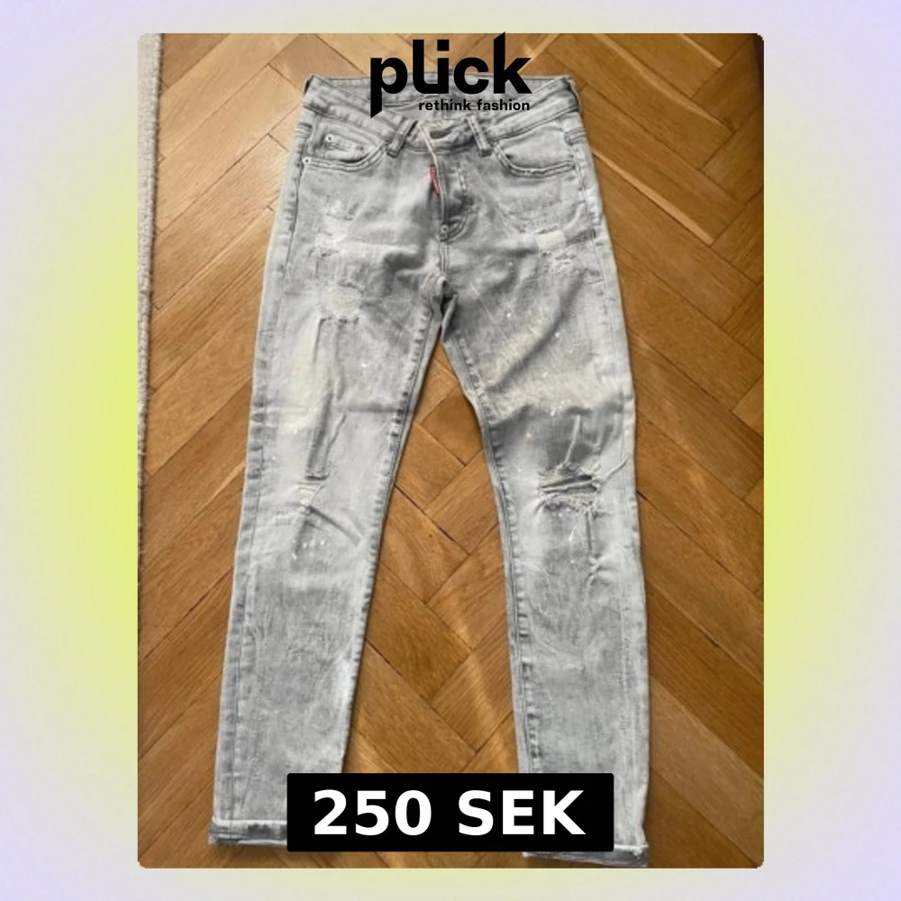 Säljer ett par Dsquared2 skinny jeans i grå tvättad färg med slitna detaljer och färgstänk. Modellen är 71630 och har klassisk femficksdesign, knappgylf och Dsquared2-röd etikett. Jeansen är tillverkade i Italien och har en cool, modern look.