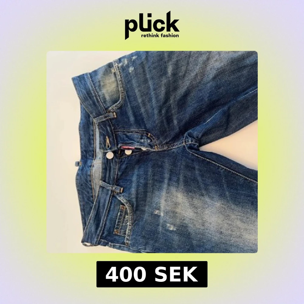 Säljer ett par snygga blå jeans från Dsquared2 i italiensk design. Jeansen har slitna detaljer, klassisk femficksmodell och knappar framtill. Materialet är robust denim med coola tvättade effekter och kontrastsömmar. Perfekt för dig som gillar streetstyle och exklusiva märken.