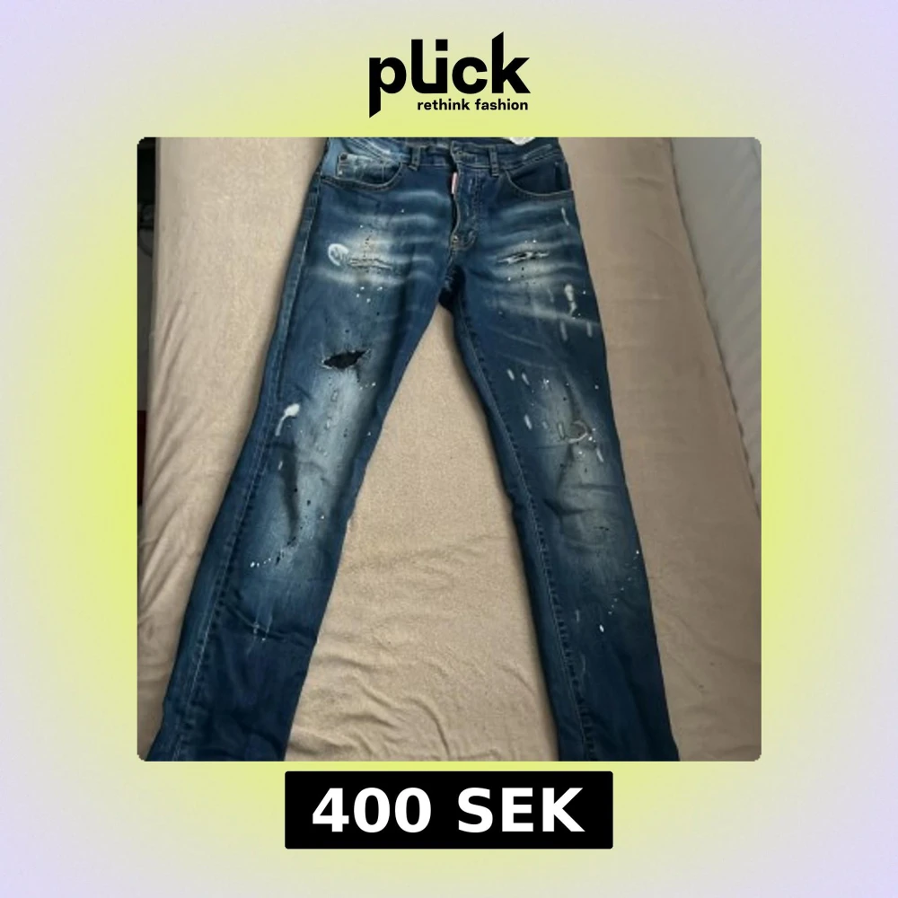 Säljer ett par blå slim fit jeans från Dsquared2 med coola slitningar, färgstänk och patch med siffran 64 bak. Jeansen har klassisk femficksdesign och är tillverkade i bomull. Perfekt för dig som gillar en edgy streetstil.