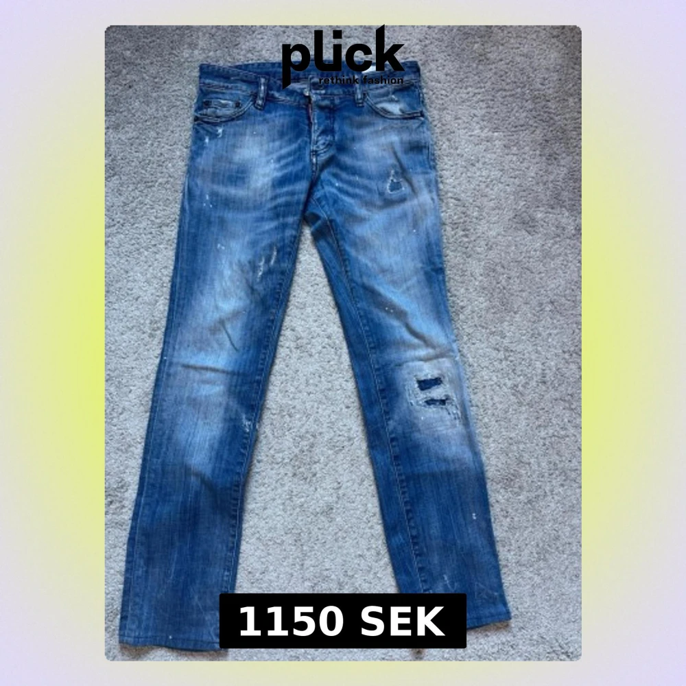Säljer ett par blå jeans från Dsquared2 med snygga slitningar och distressed detaljer. Jeansen har klassisk femficksmodell, normal passform och raka ben. Tillverkade i Italien i mjukt bomullsmaterial. Perfekta för dig som gillar en avslappnad och trendig look.