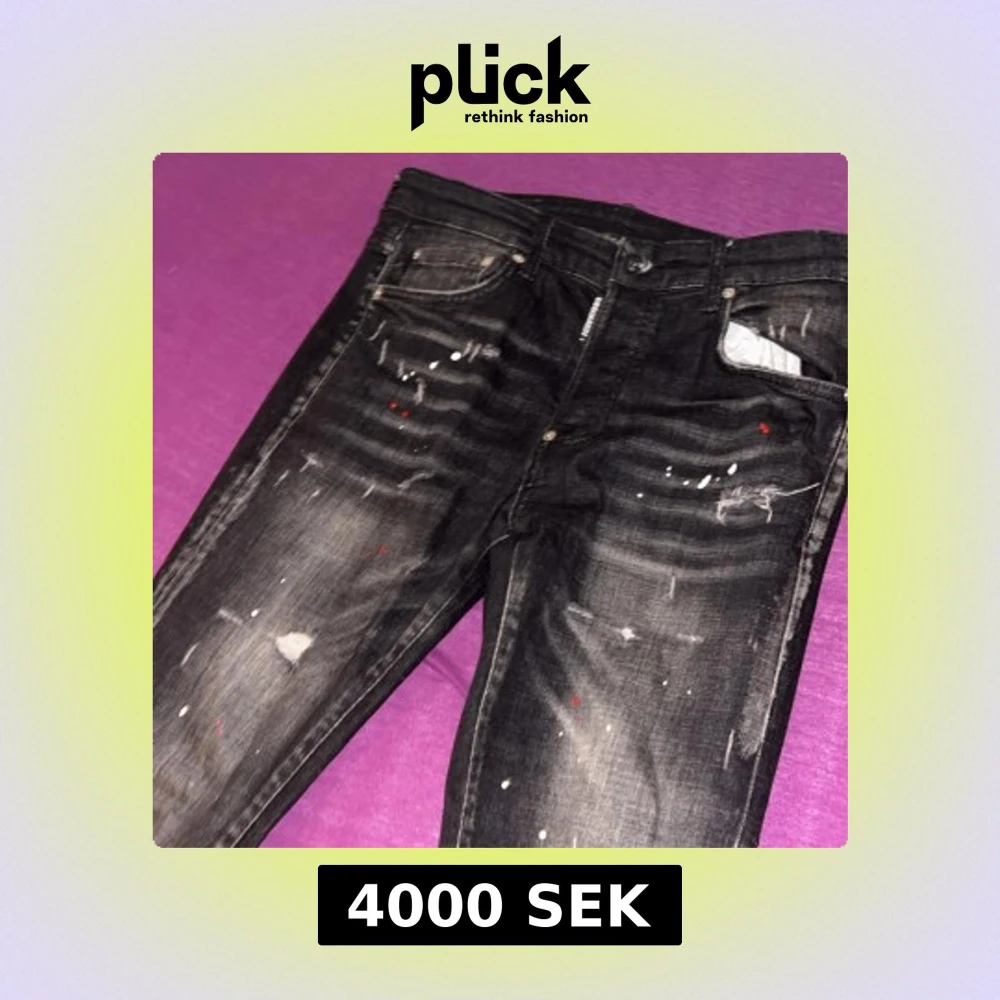 Säljer ett par svarta jeans från Dsquared2 med coola slitningar och färgstänk i vitt och rött. Jeansen har en slim passform, klassiska fem fickor och snygg Dsquared2-lapp bak. Tillverkade i Italien i stretchig bomull för skön känsla. Ny pris 4800 mitt pris 4000 priset kan sänkas