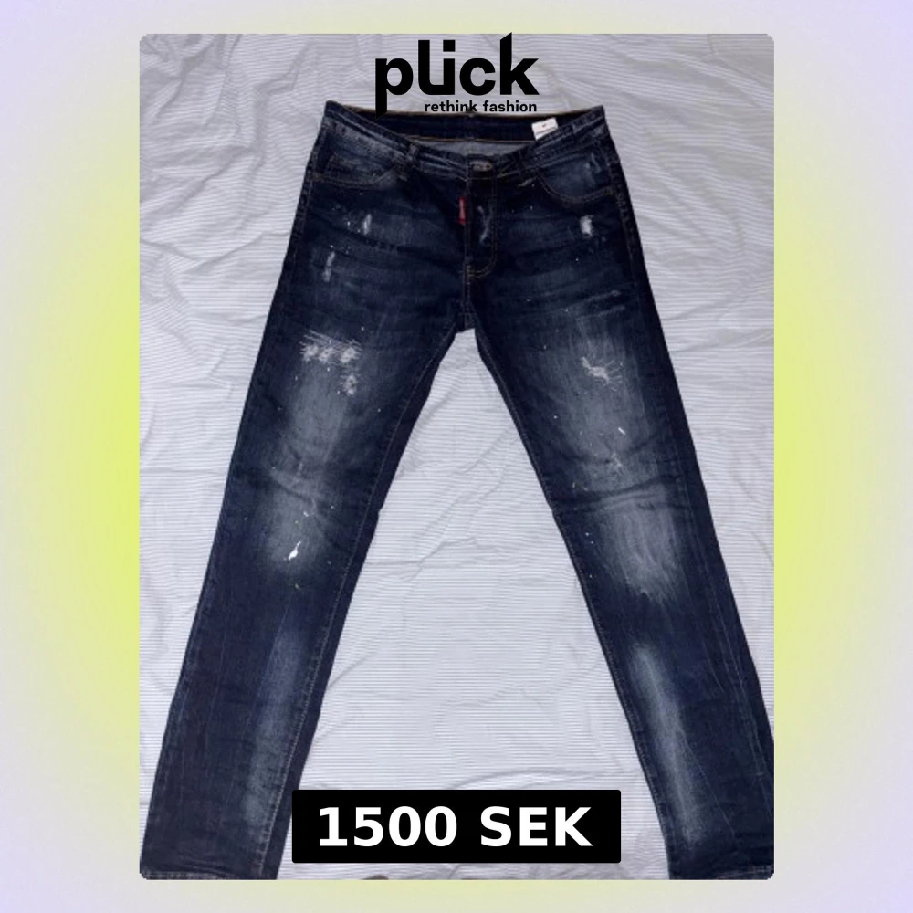 Säljer ett par mörkblå jeans från Dsquared2 med coola slitningar och färgstänk. Jeansen har klassisk femficksdesign, gul Dsquared2-patch bak och smal passform. Snygga kontrastsömmar och detaljer som ger en edgy vibe. Perfekta för dig som gillar streetstyle.
