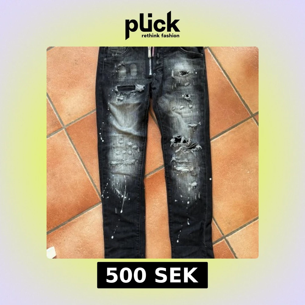 Snygga svarta jeans från Dsquared2 med slitningar, hål och coola färgstänk. Jeansen har dragkedja framtill med Dsquared2-logga. Storlek S
