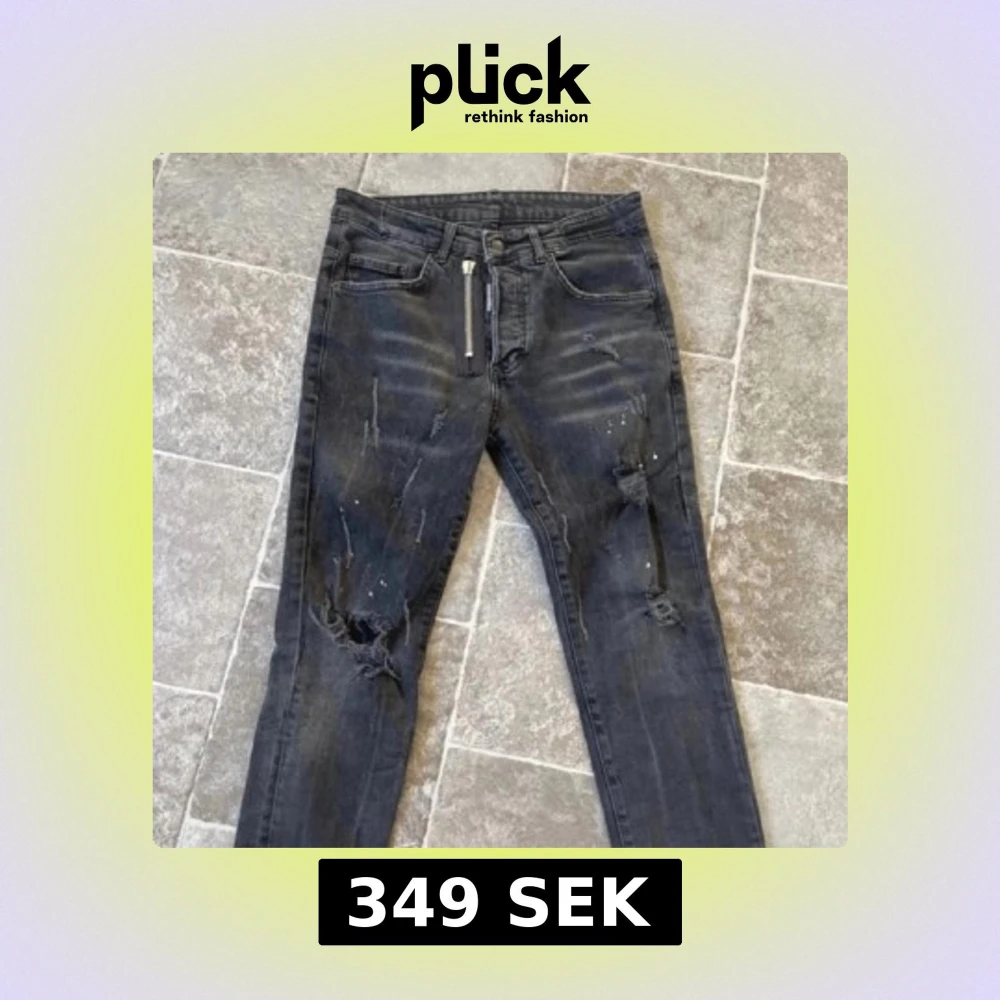 Säljer ett par svarta jeans från Dsquared2 med slitningar och färgstänk på benen. Jeansen har dragkedja, fem fickor och klassisk Dsquared2-logga vid gylfen. Snygg, smal passform och cool streetstil.