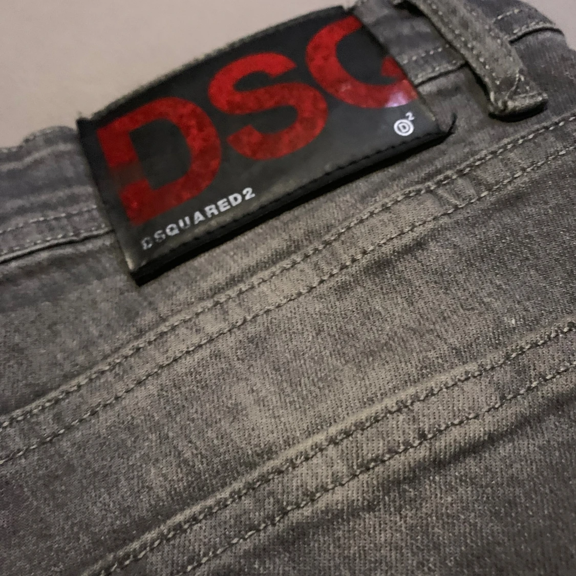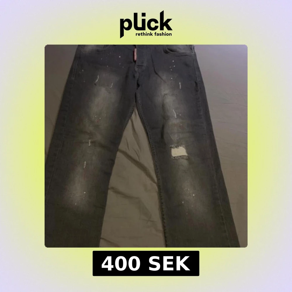 Säljer ett par grå jeans från Dsquared2 med coola slitningar, färgstänk och patchdetaljer. Jeansen har en rak passform och klassisk femficksdesign. Perfekta för dig som gillar en edgy streetstil.