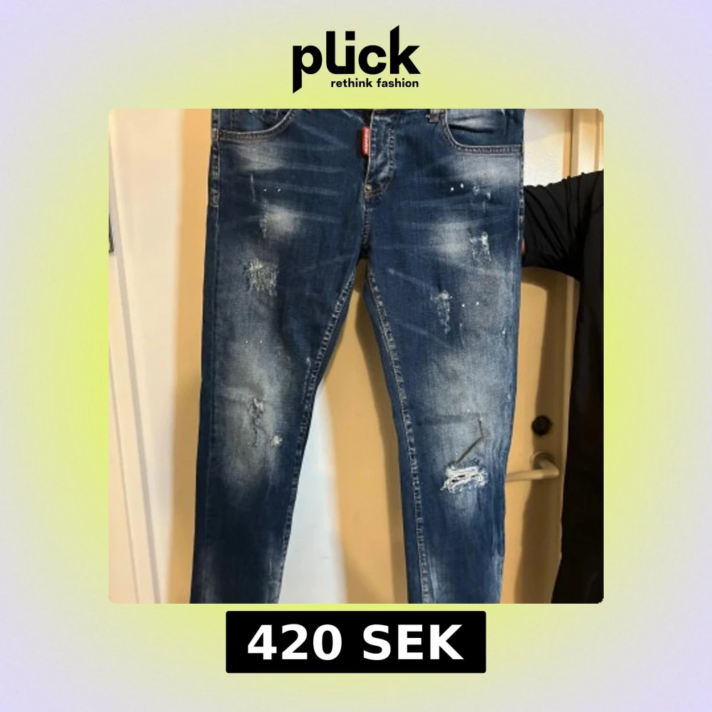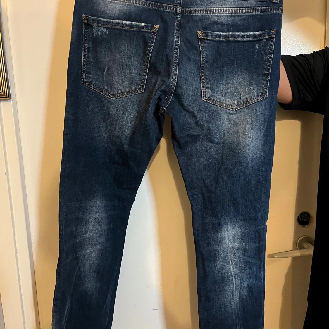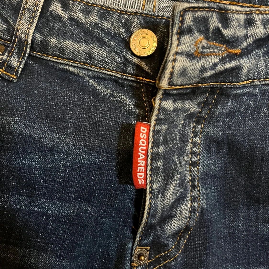 Snygga blå jeans från Dsquared2 med slitna detaljer, färgstänk och patchade hål för en riktigt edgy look. Klassisk femficksmodell med normal passform och tydlig Dsquared2-logga på röd etikett vid gylfen. Jeansen är tillverkade i denim med cool tvätt.