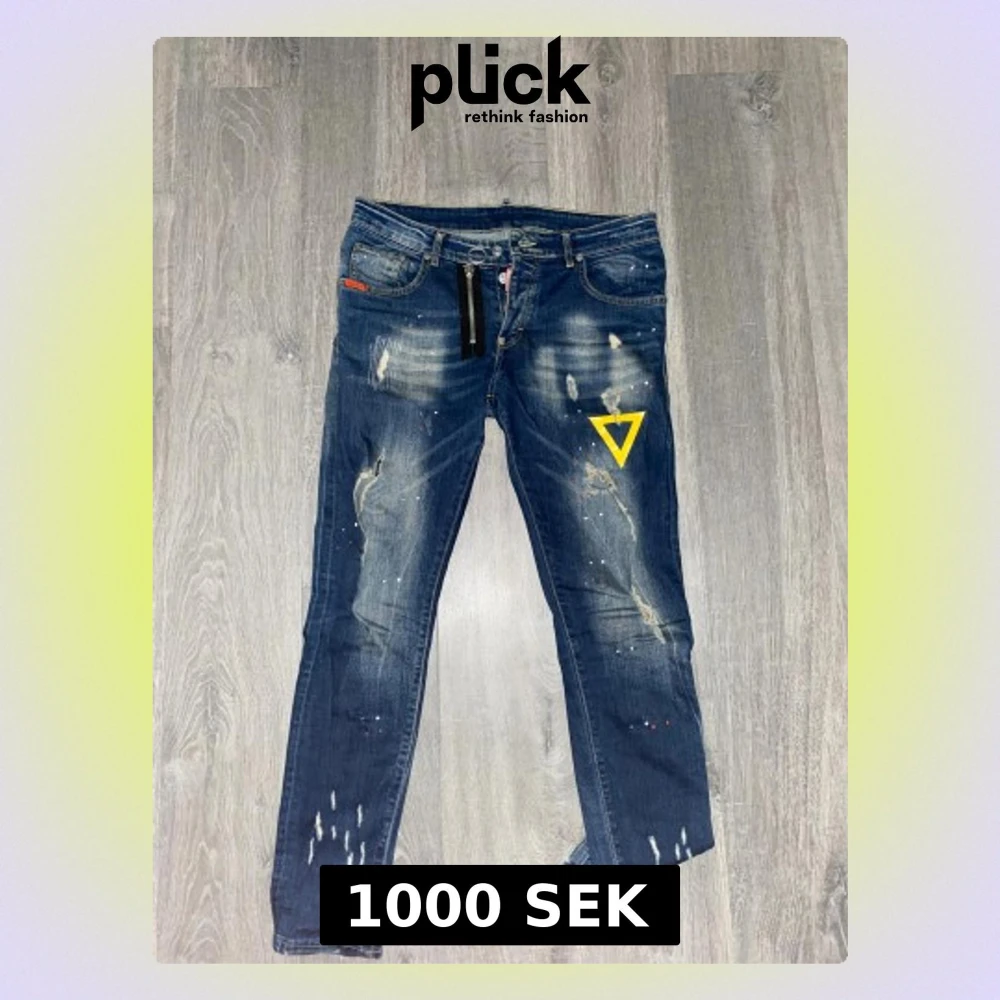 Snygga blå jeans från Dsquared2. Jeansen har slitna detaljer, färgstänk och en gul tryckt symbol på ena benet. Klassisk femficksmodell med dragkedja och knapp, samt Dsquared2-logga på bakfickan. Perfekt för dig som gillar streetstyle.