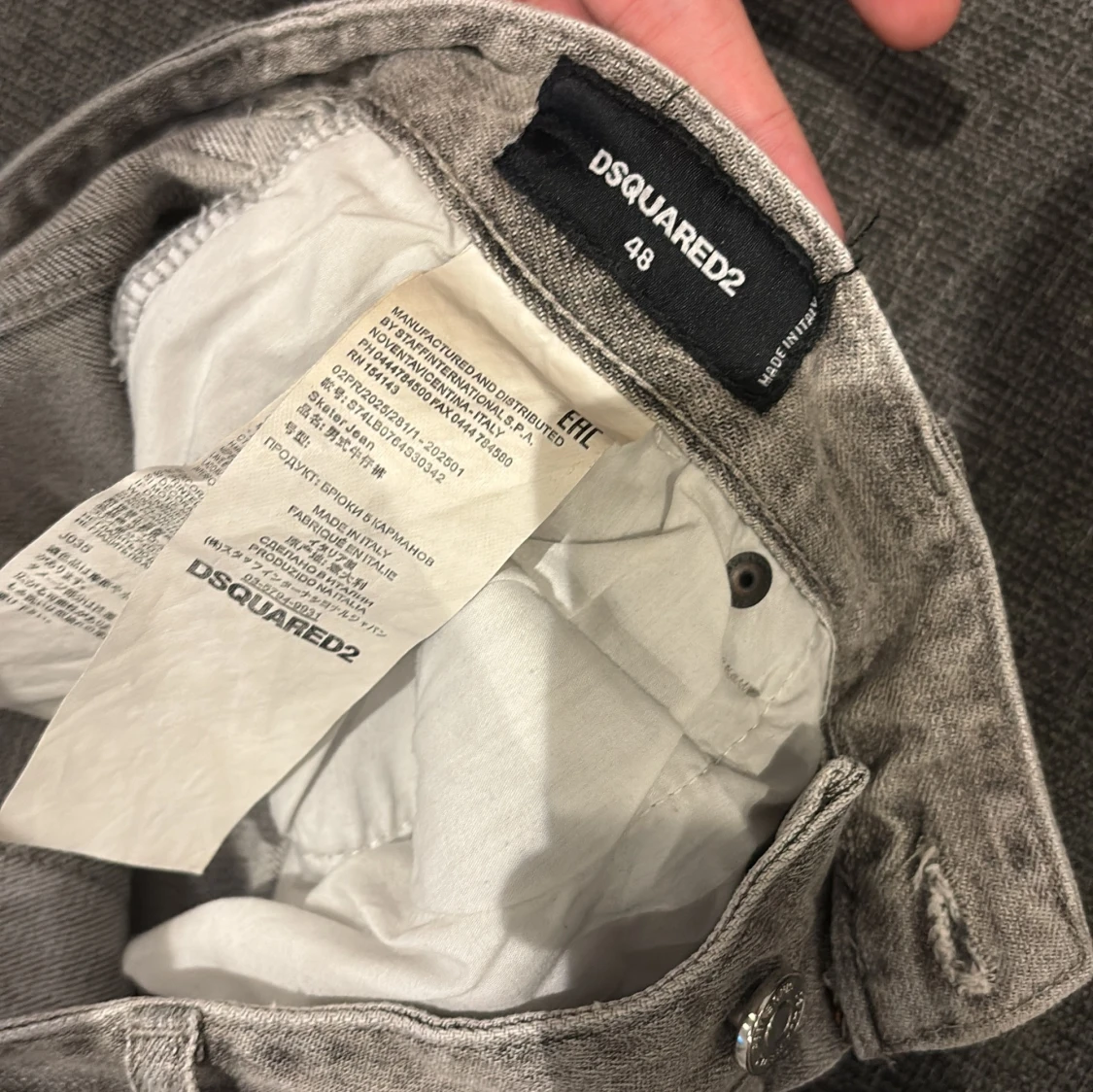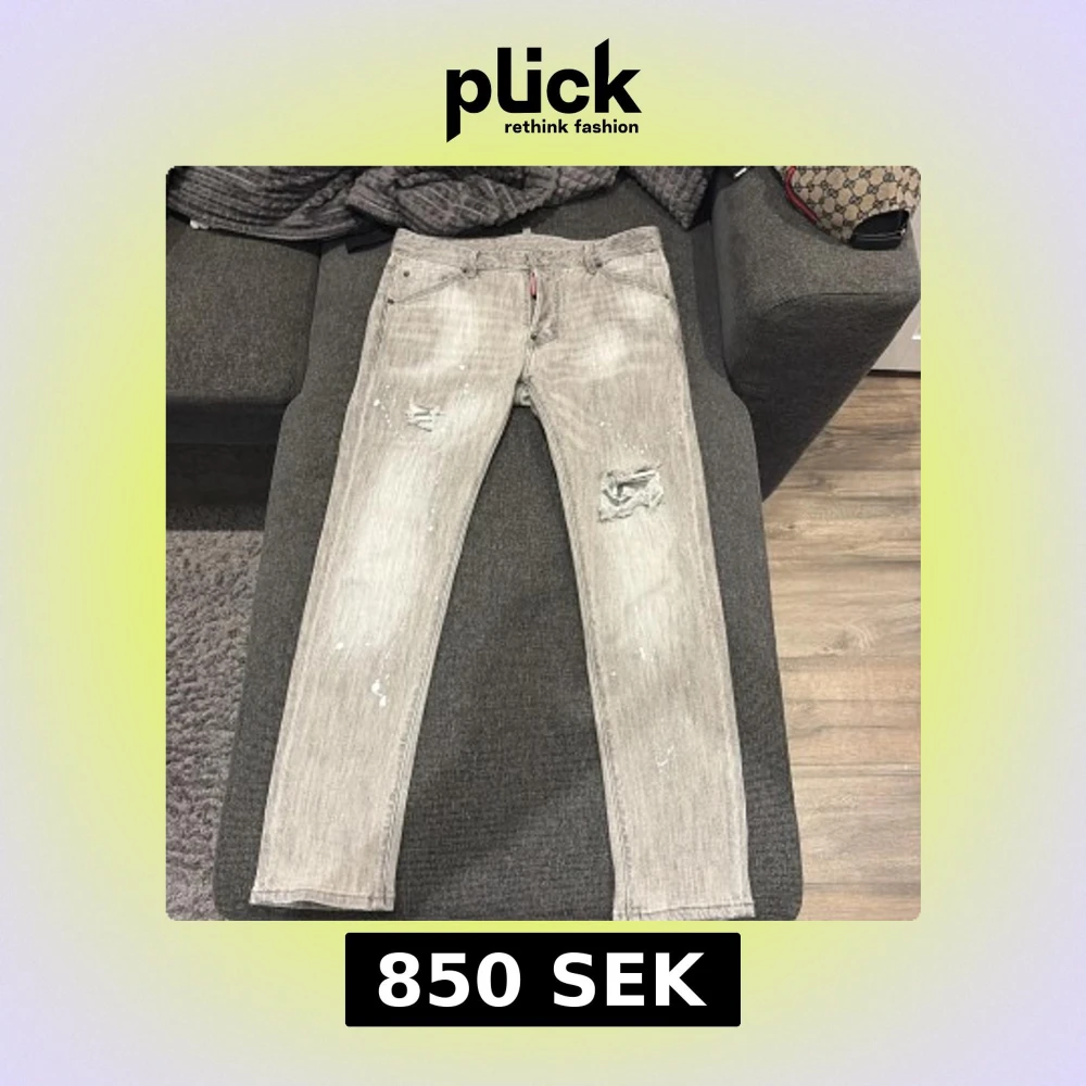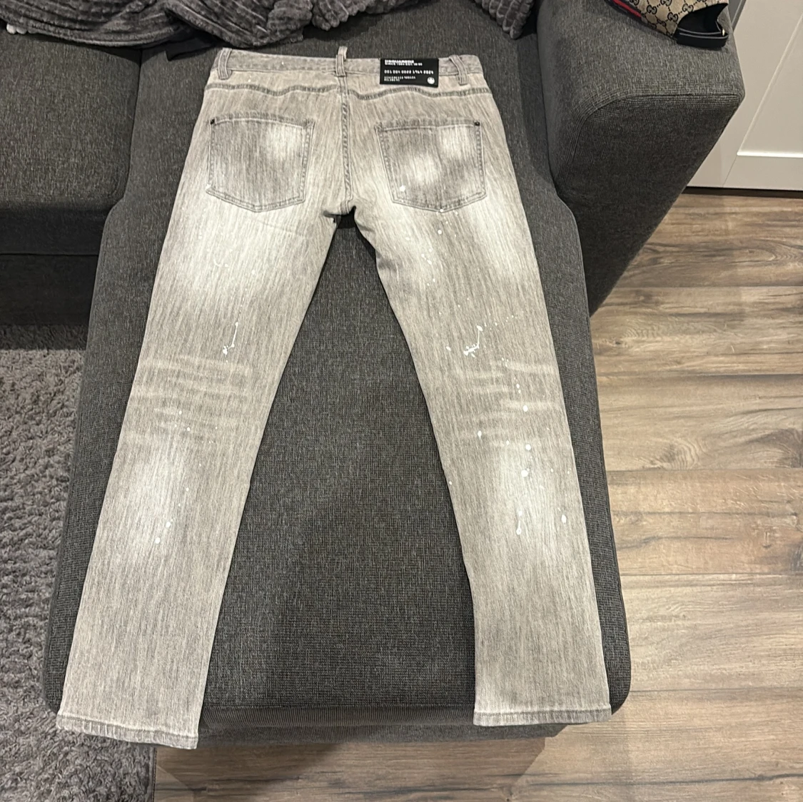 Säljer ett par grå jeans från Dsquared2 med coola slitningar och färgstänk på benen. Jeansen har rak passform, klassisk femficksdesign och tydlig Dsquared2-logga vid fickan. Perfekta för dig som gillar en edgy streetstil.