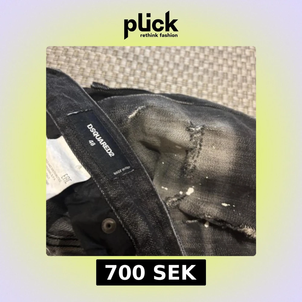 Säljer ett par svarta jeans från Dsquared2 i storlek 48. Jeansen har en cool tvätt med slitningar, färgstänk och trasiga detaljer för en edgy look.