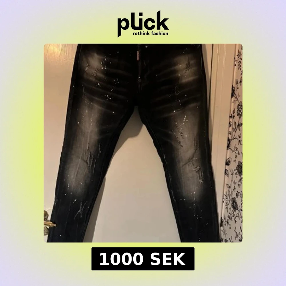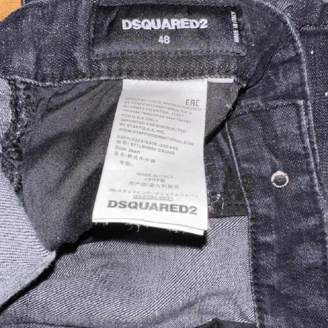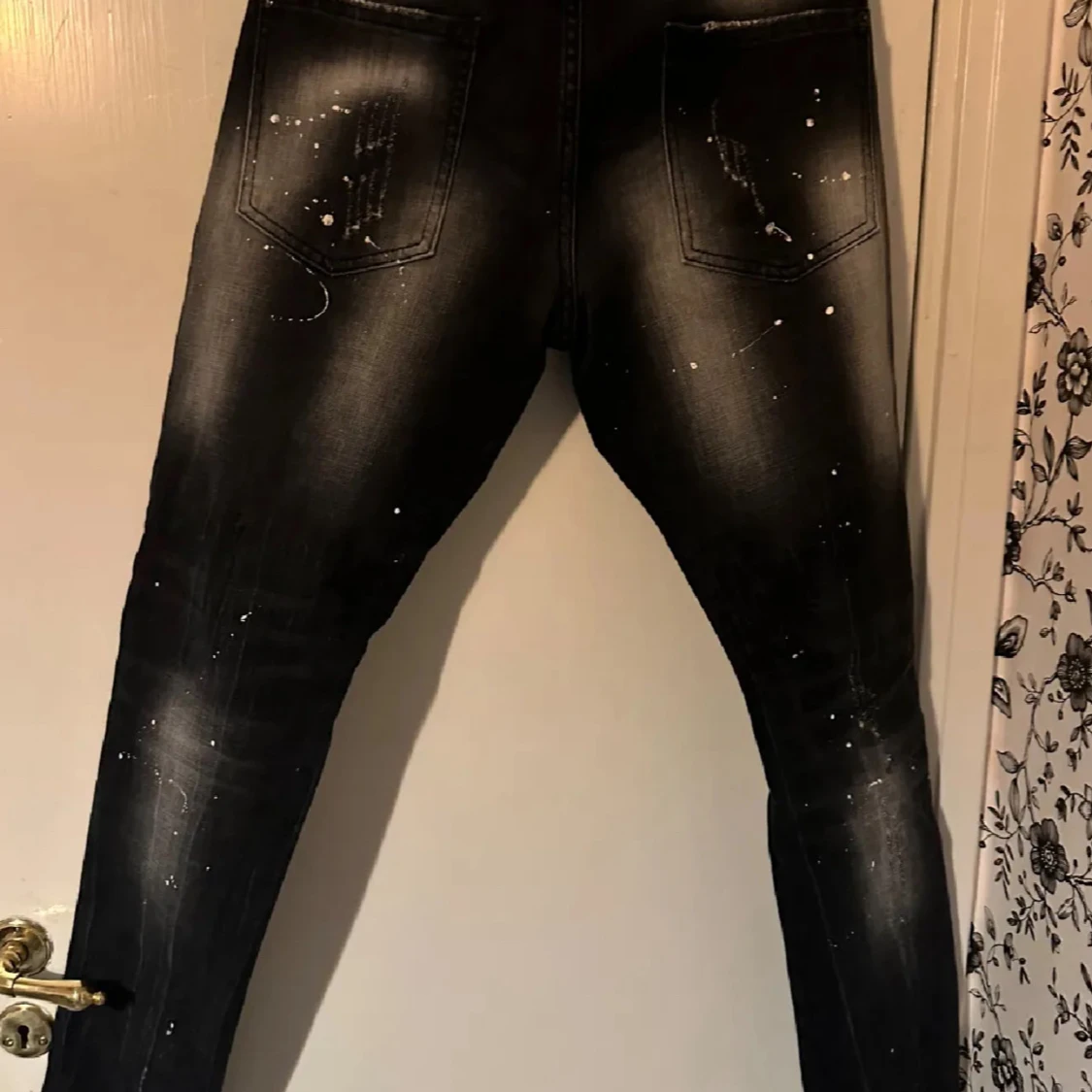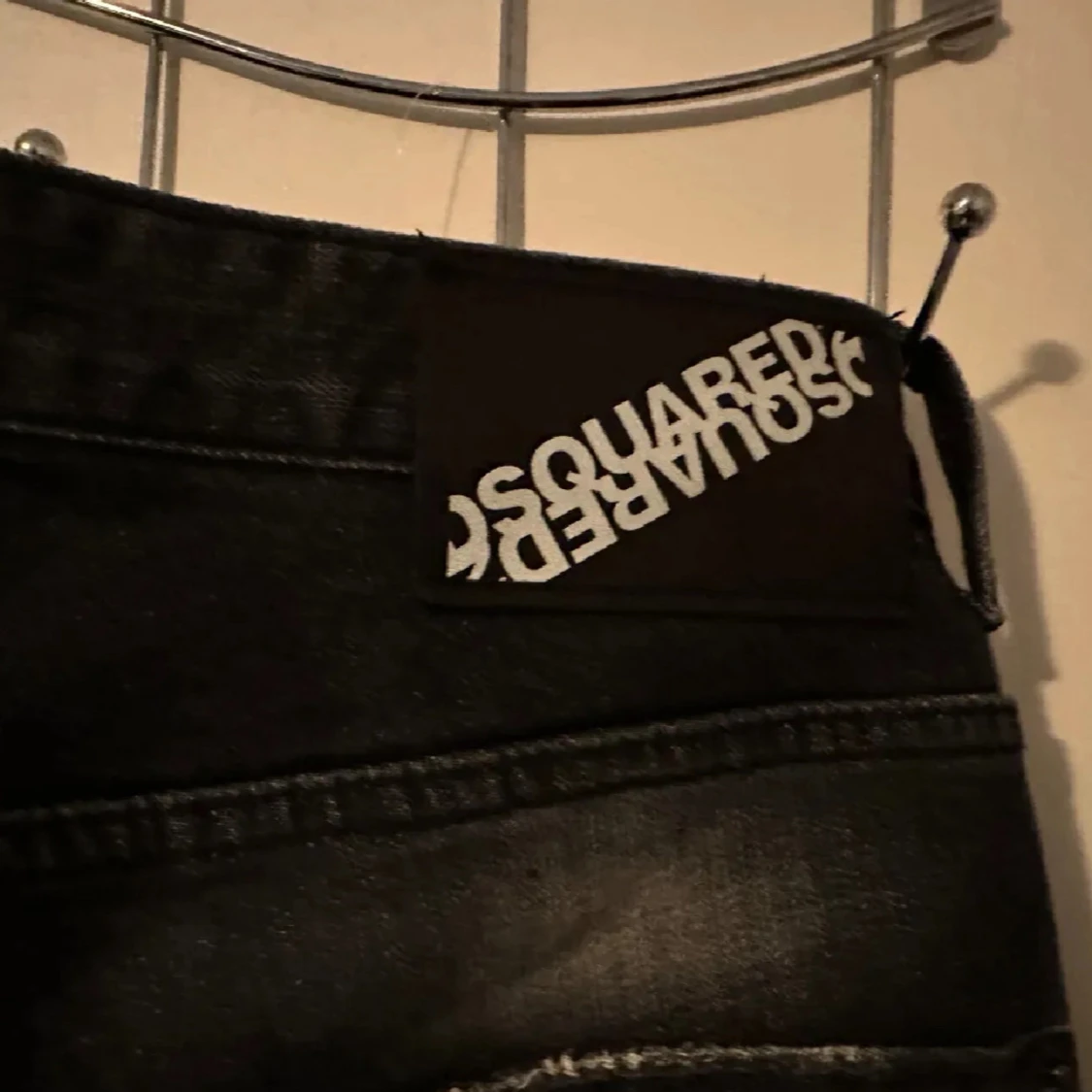 Säljer ett par svarta jeans från Dsquared2 med coola slitningar och vita färgstänk. Jeansen har en smal passform och klassisk femficksdesign. Märkeslapp bak i midjan.priset är inte hugget i sten och byxrona är som nya