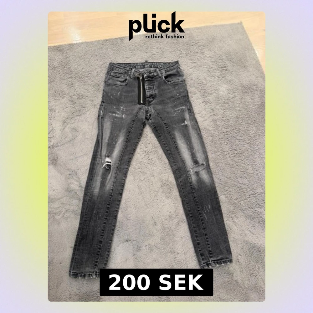 Säljer ett par grå jeans med slitningar och cool dragkedjedetalj framtill. Jeansen har en tvättad look, flera fickor och råa kanter vid bensluten. Perfekta för dig som gillar en edgy stil.