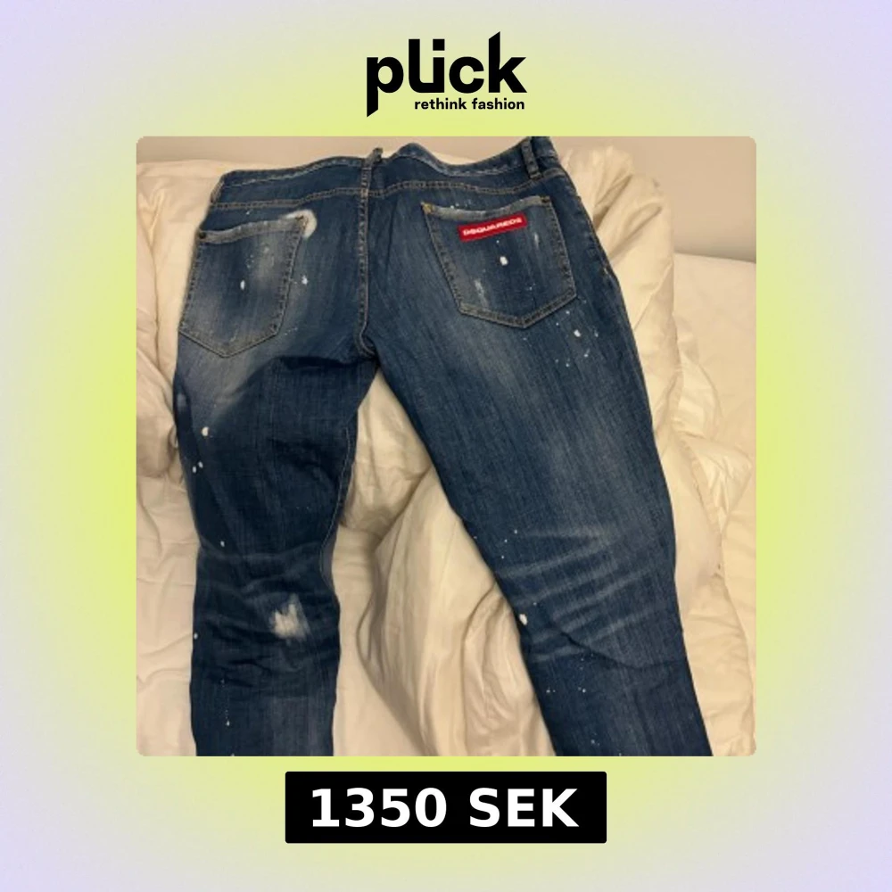 Säljer ett par blå jeans från Dsquared2 med coola slitningar, hål och färgstänk för en edgy look. Klassisk femficksmodell med Dsquared2-logga på bakfickan och knappgylf framtill. Perfekt för dig som gillar streetstyle och vill sticka ut. använda 3 gånger . Str 50