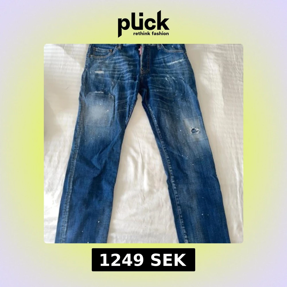 Snygga blå Dsquared2 Skater Jeans med slitningar, färgstänk och distressed detaljer. Klassisk femficksmodell med smal passform och coola slitna partier. Jeans i bomull med tydliga tvättade effekter och unika detaljer som sticker ut. Jag har vanligtvis storlek 46-48 i dsq2 så dessa byxor passar även bra
