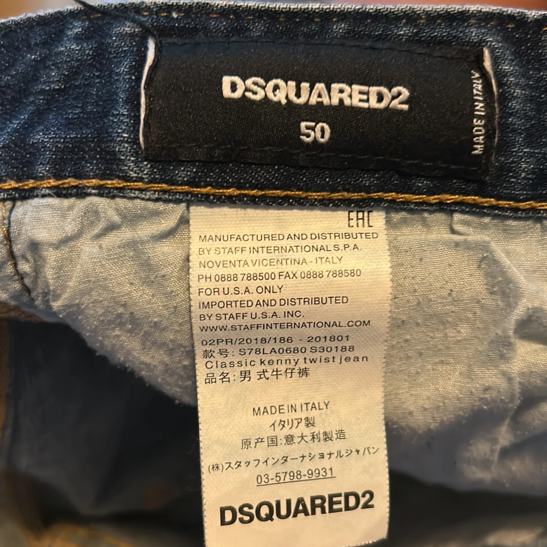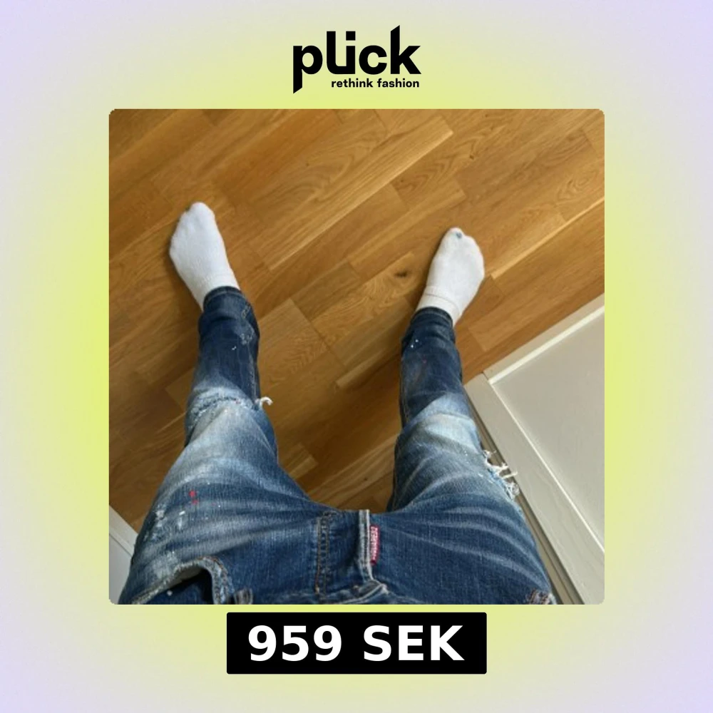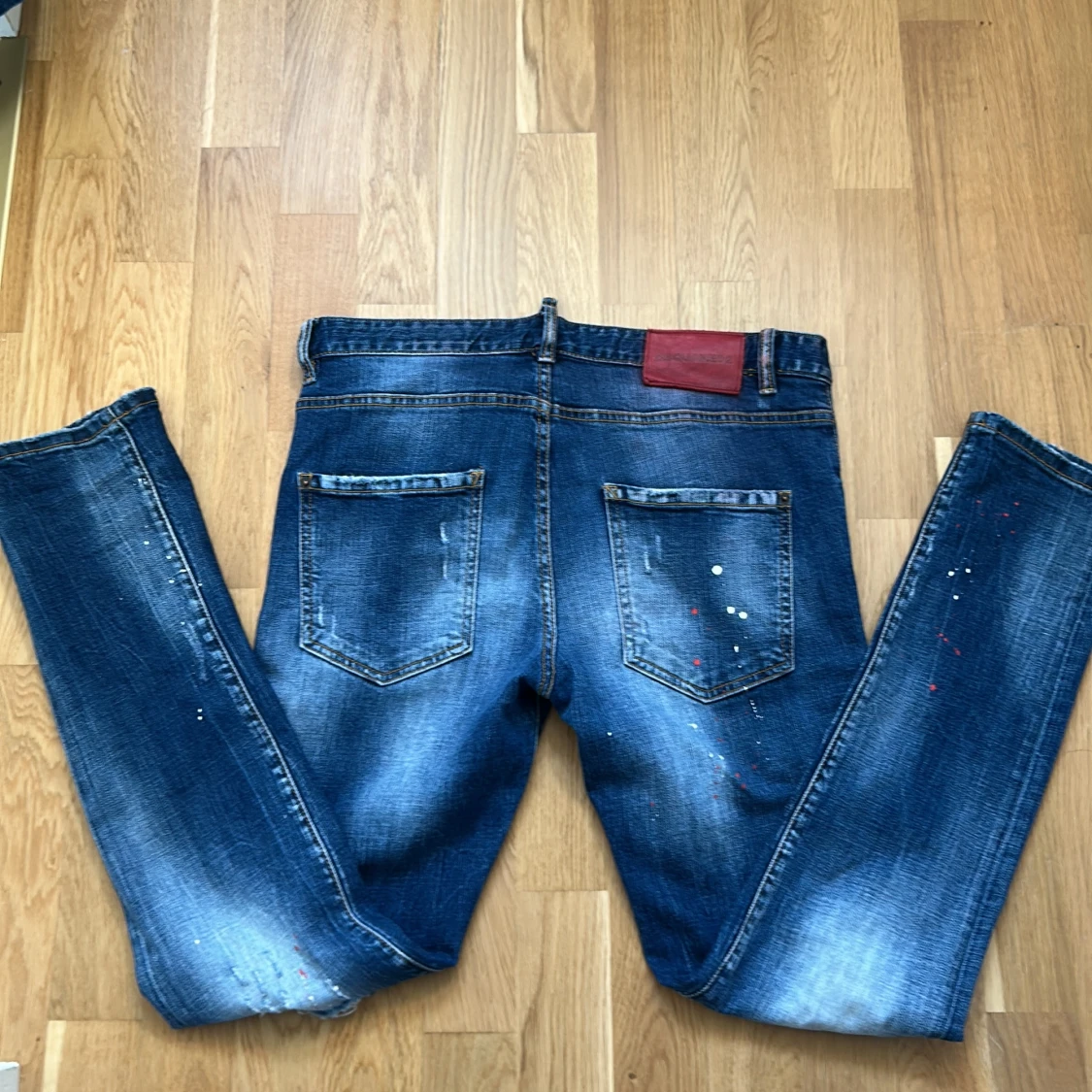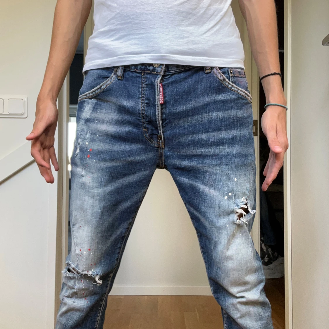 Säljer ett par blå Dsquared2 jeans med feta slitningar och paint splatter. Nypris ca 3000kr. Storlek: 50 som är 32/32 men passar 31