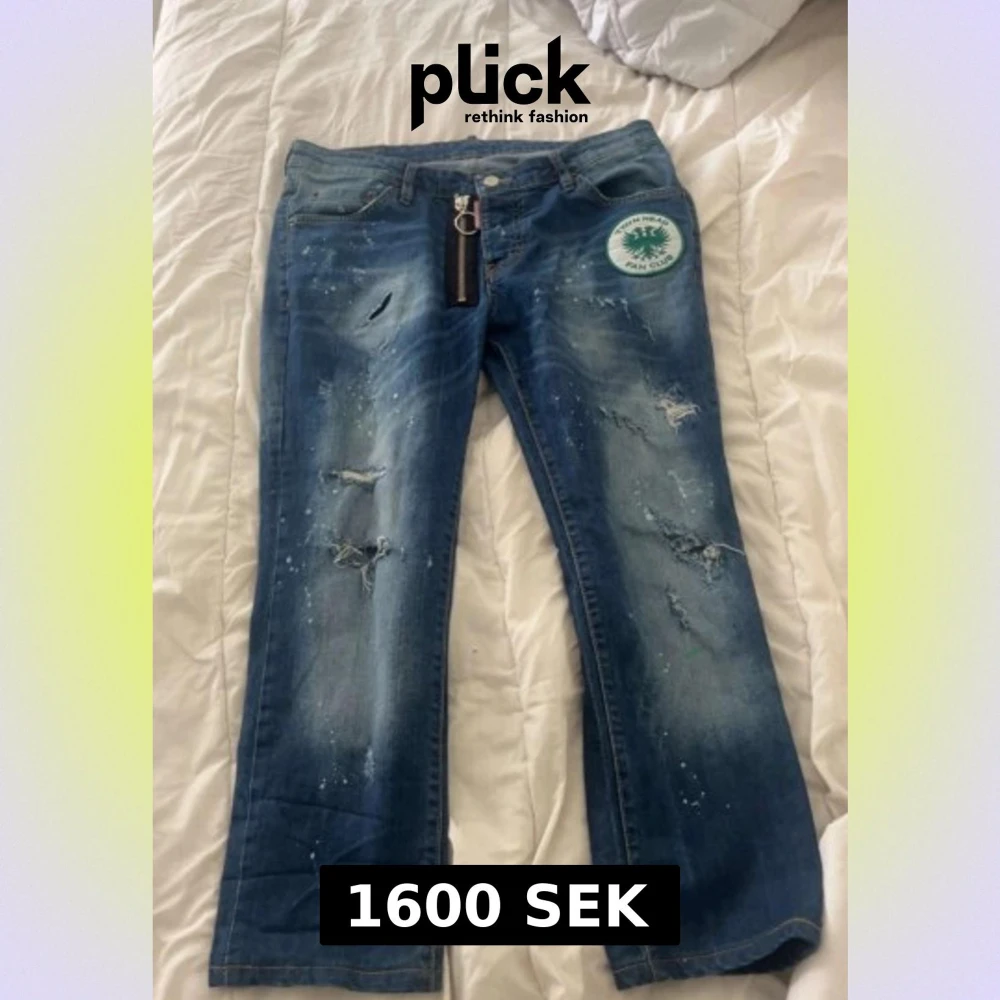 Säljer ett par blå Dsquared2 jeans i slim fit med slitningar, färgstänk och en stor grön/vit Twin Head-patch på framsidan. Jeansen har klassisk femficksdesign, dragkedja och läderpatch bak i midjan. Riktigt snygga detaljer och cool streetkänsla.