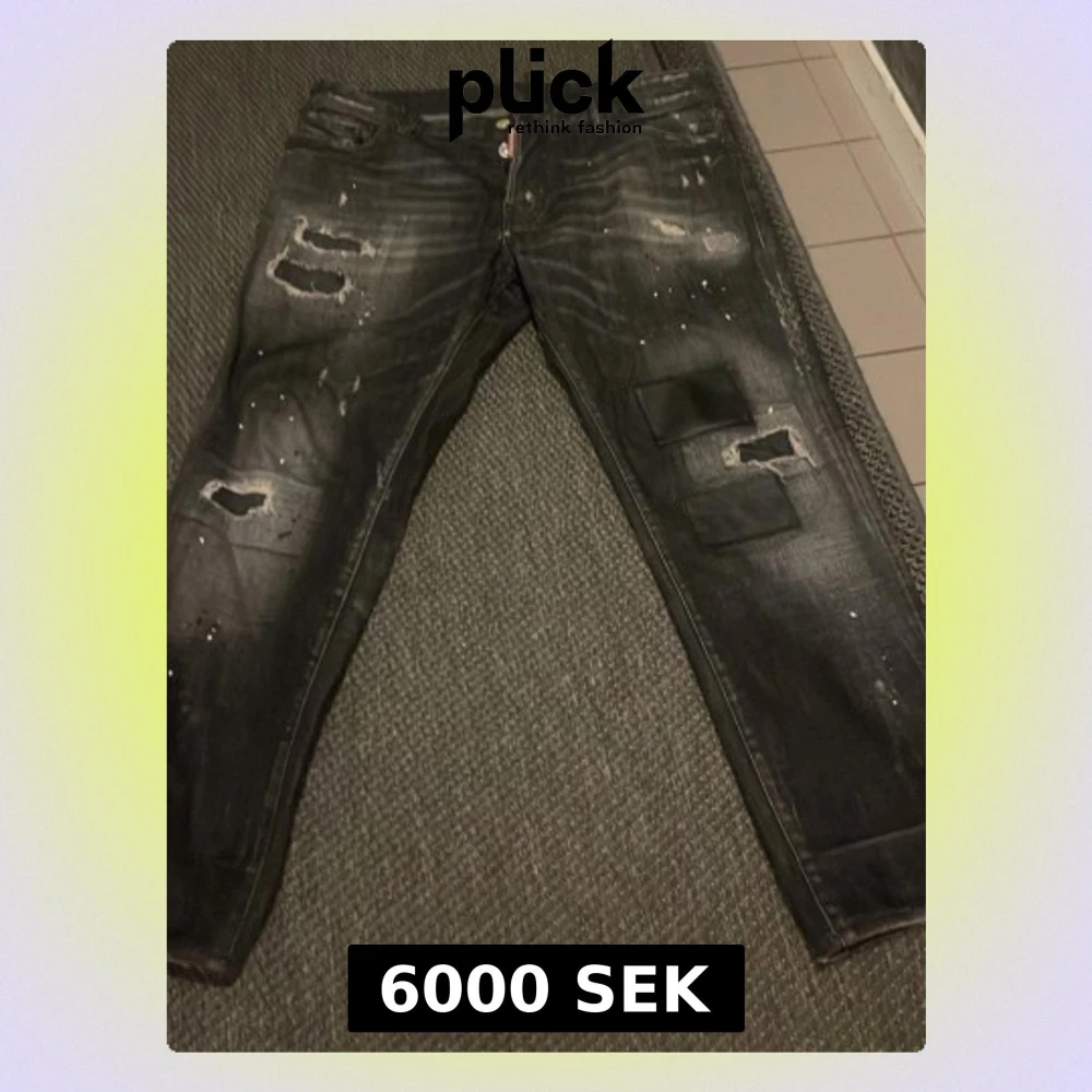 Riktigt snygga svarta jeans från Dsquared2 med slitningar, patchdetaljer och färgstänk. Jeansen har en rak passform och klassisk femficksdesign. Materialet är bomull med en skön känsla och stretch. Perfekta för dig som gillar streetstyle aldrig använt. Har använt den bara nåra gånger