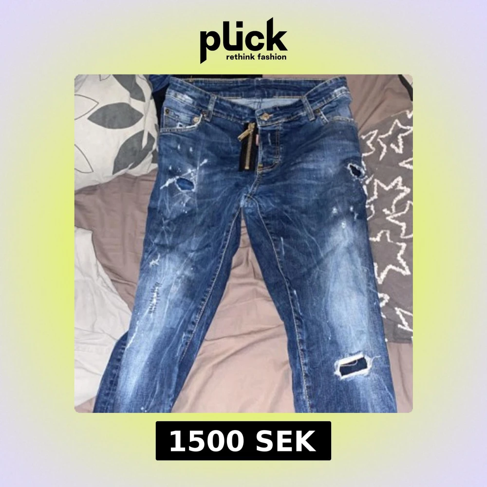 Blå jeans från Dsquared2 med coola slitningar, hål och färgstänk. Snygg, stor dragkedja framtill och klassiska kontrastsömmar. Jeansen har en modern, streetig look och är tillverkade i denim med detaljer som sticker ut.