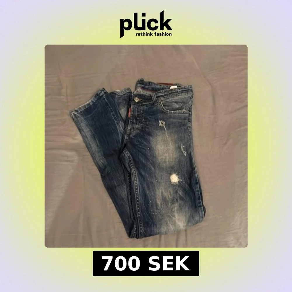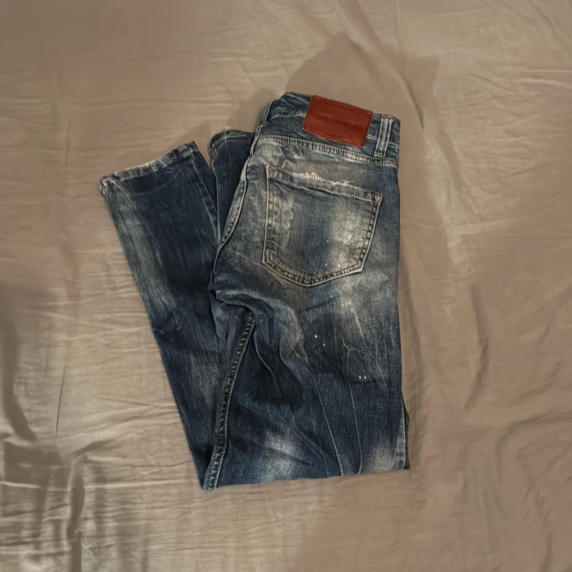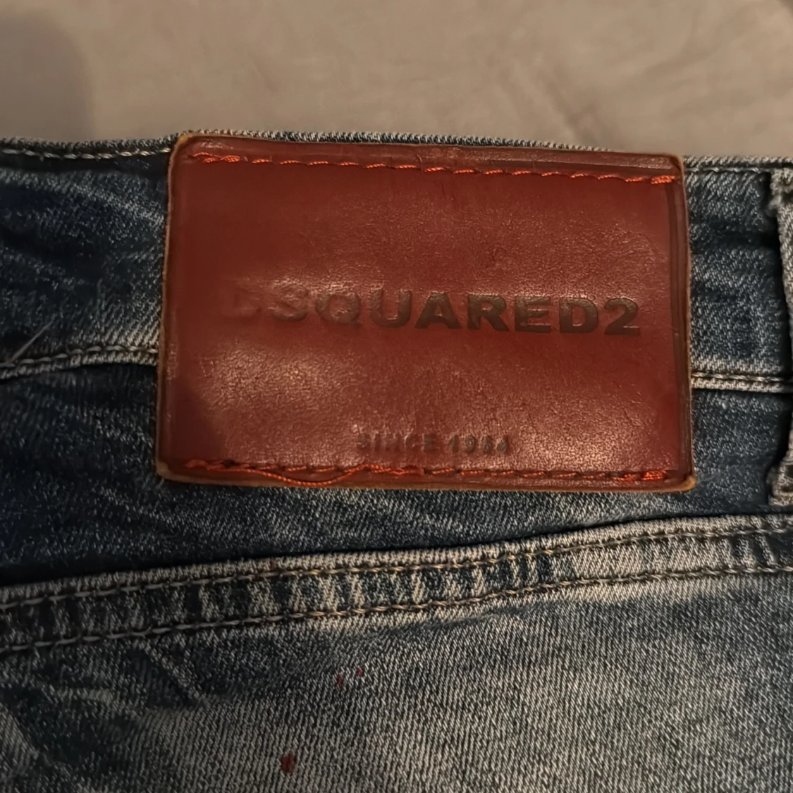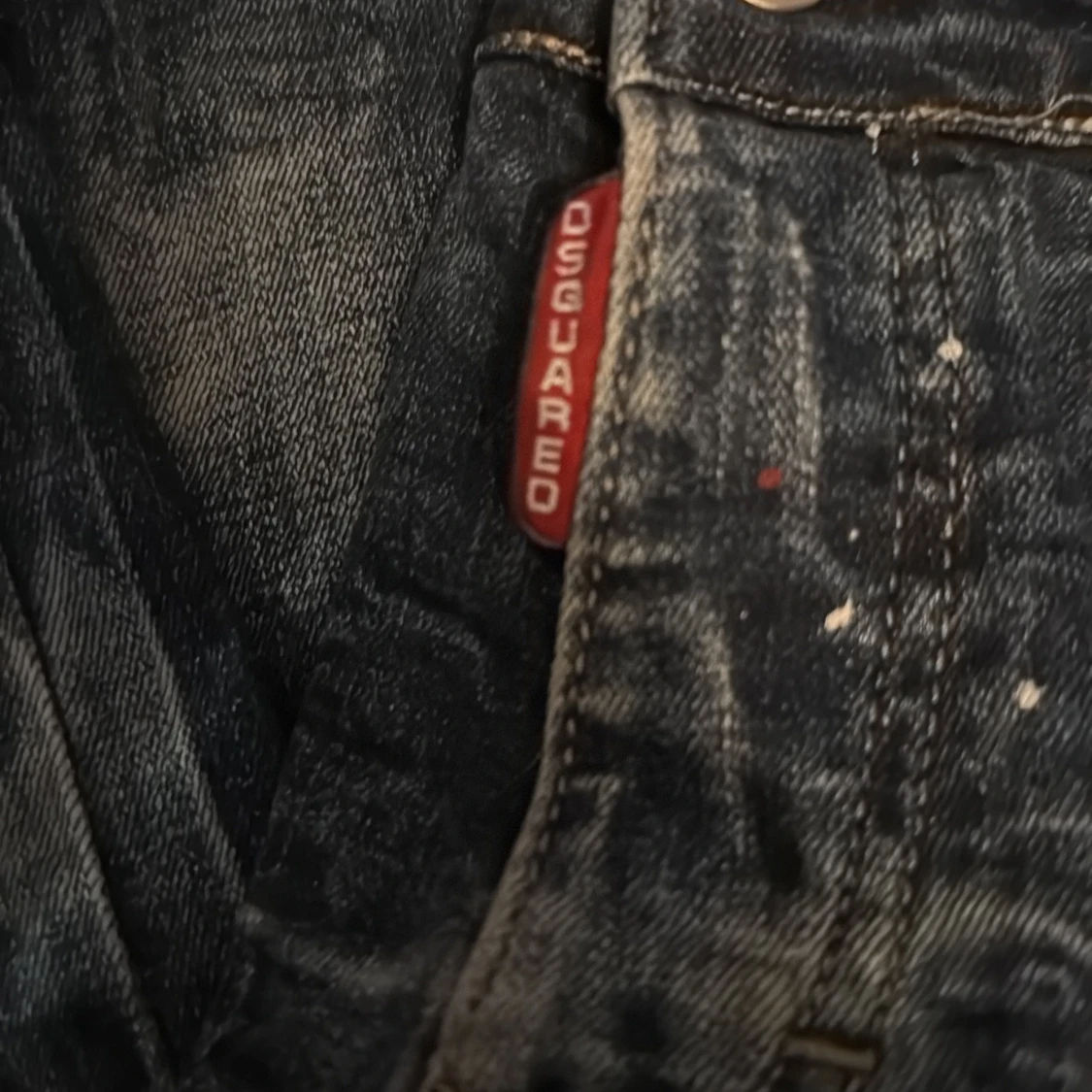 Snygga blå jeans från Dsquared2 med coolt distressed och slitna detaljer samt färgstänk. Klassisk femficksmodell med läderpatch bak i midjan och Dsquared2-logga vid fickan. Jeansen har en rak passform och är tillverkade i bomull.