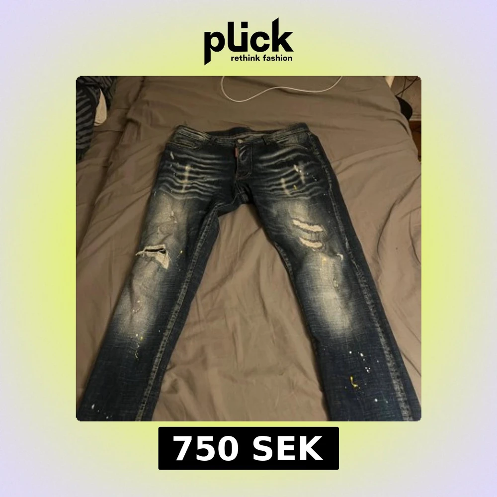 Säljer ett par blå Dsquared2 jeans med slitna detaljer, färgstänk och tydlig tvättad effekt. Jeansen har raka ben, klassisk femficksdesign och läderpatch bak i midjan. Materialet är bomull och de har en cool, streetig vibe.