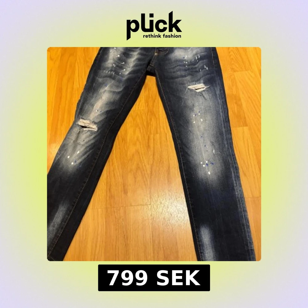 Snygga blå jeans från Dsquared2 med slitna detaljer och färgstänk i vitt och blått. Jeansen har en smal passform, klassisk femficksdesign och coola slitningar på benen. Perfekta för dig som gillar en edgy streetstil. (STORLEK 30/31)