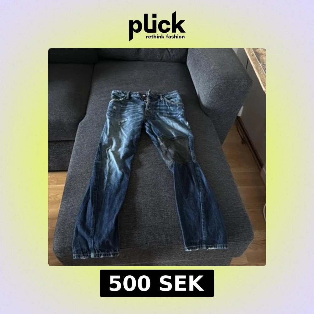 Säljer ett par blå Dsquared2 jeans med coola slitningar och en svart patch på ena benet. Jeansen har knappar med logga, klassisk femficksmodell och snygg tvätt. Perfekt för dig som gillar streetstyle och unika detaljer.