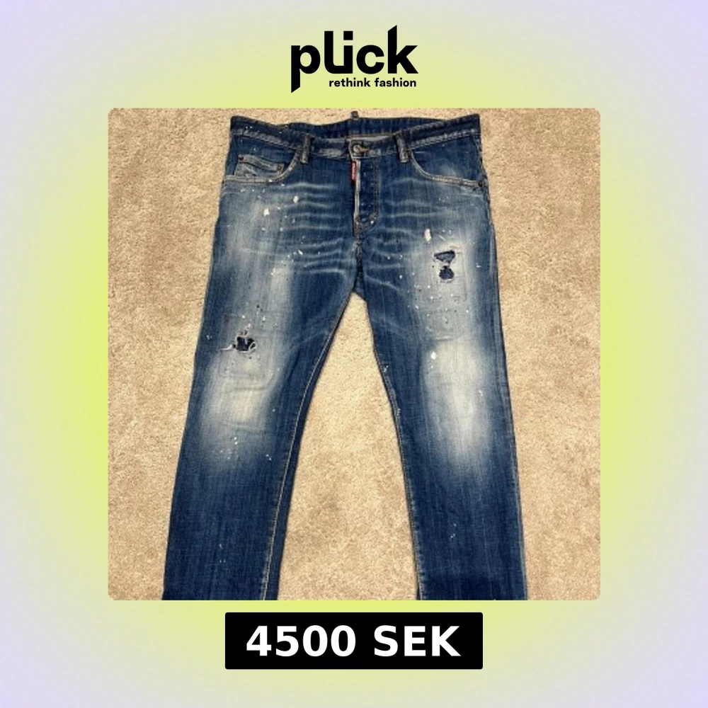 Snygga blå jeans från DSQUARED2 i storlek 52 med coola slitningar och färgstänk på både fram- och baksida. Klassisk femficksmodell med logotypdetaljer och en modern, smal passform. Tillverkade i bomull med jeansmaterial för en autentisk känsla.