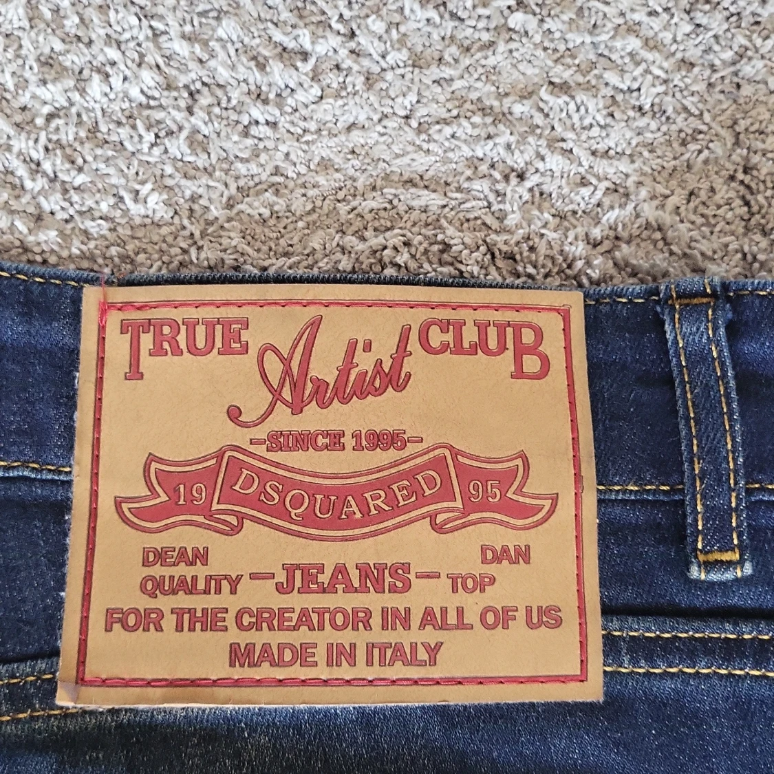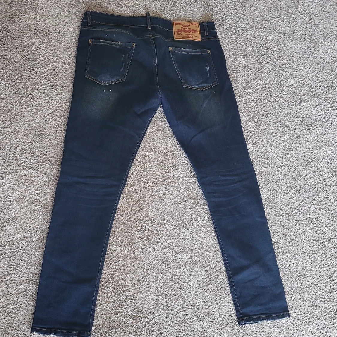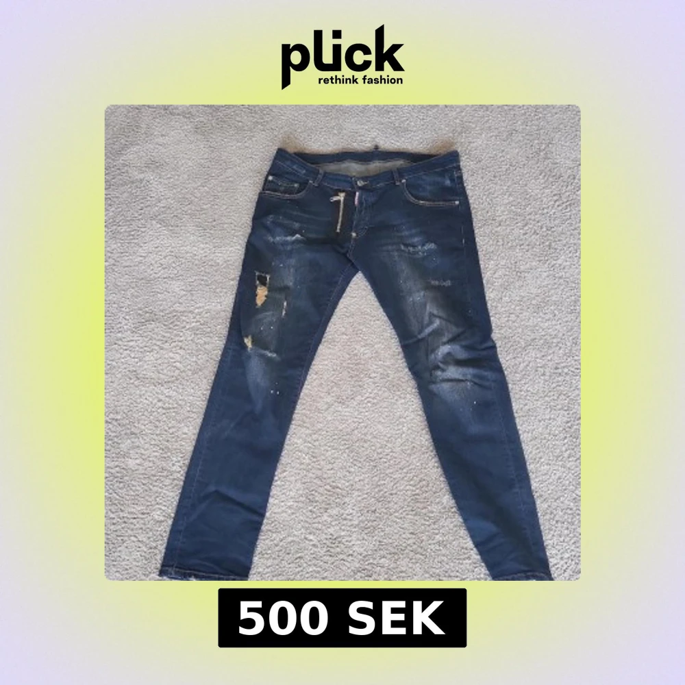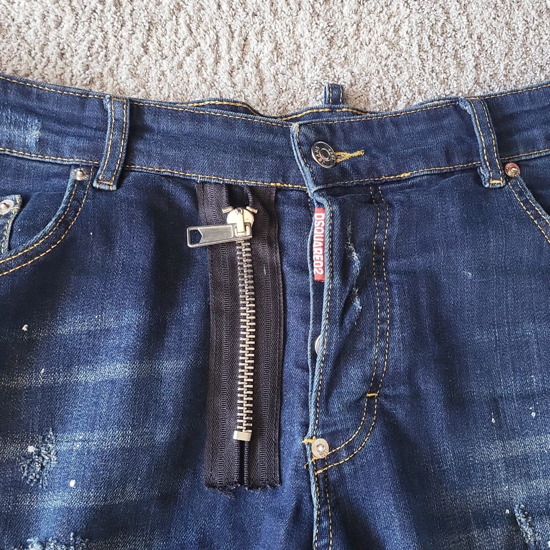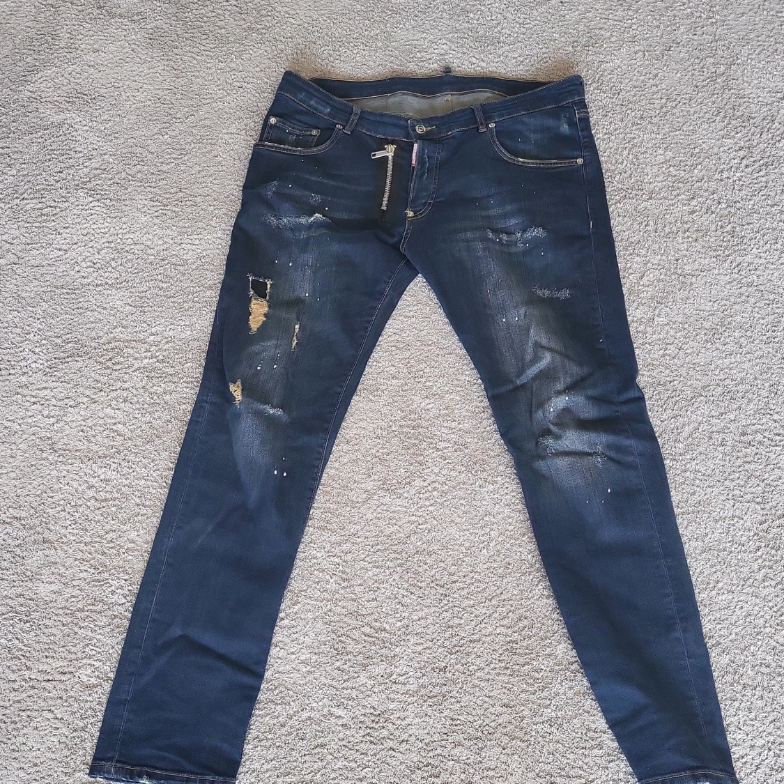 Snygga blå jeans från Dsquared2 med slitna detaljer och coola färgstänk. Modellen är skinny fit med en stor, synlig dragkedja framtill och klassiska fem fickor. Jeansen har en mörk tvätt och är tillverkade i jeansmaterial.