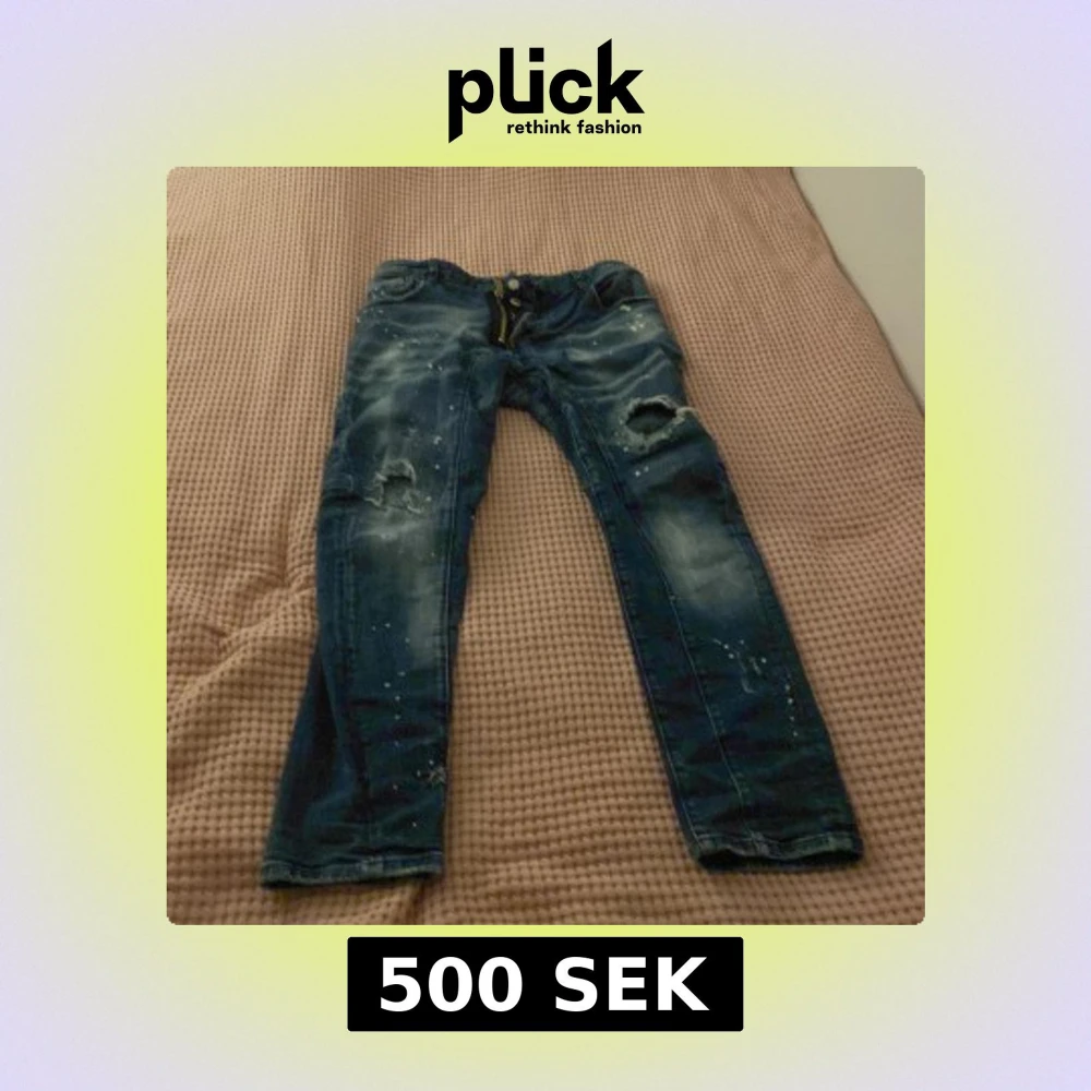 Säljer ett par blå skinny jeans från Dsquared2 med coola slitningar och färgstänk. Jeansen har en stor dragkedja framtill och klassisk femficksdesign. Snyggt tvättade detaljer och en riktigt streetig vibe. Perfekta för dig som gillar en edgy look.