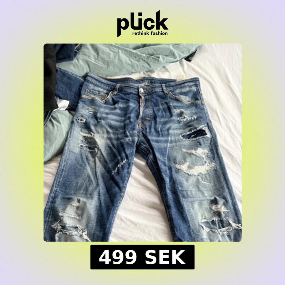 Snygga blå jeans från Dsquared2 med coolt distressed och slitna detaljer framtill. Klassisk femficksmodell med tydliga slitningar och patch med Dsquared2-logga bak. Jeansen har normal passform och är tillverkade i robust denim med orangea sömmar.
