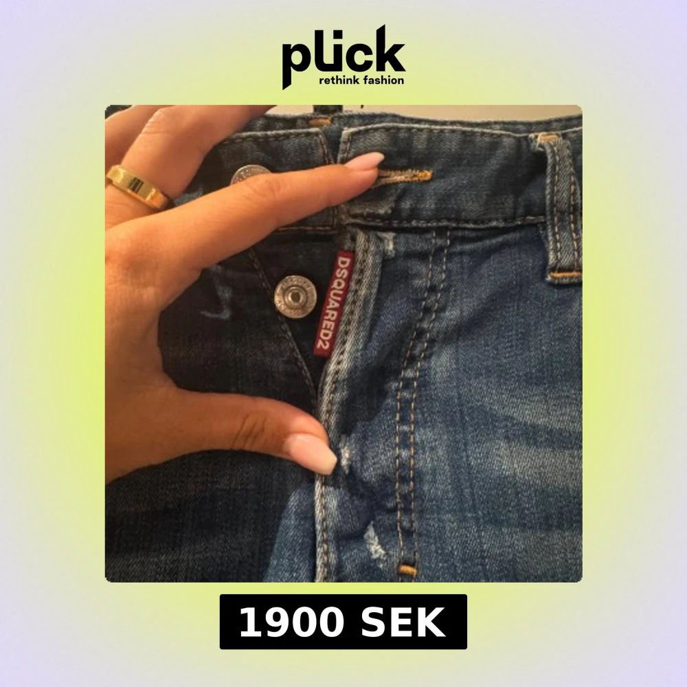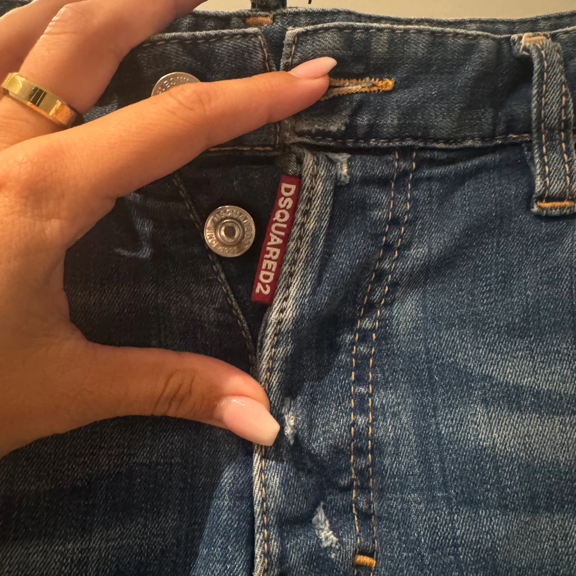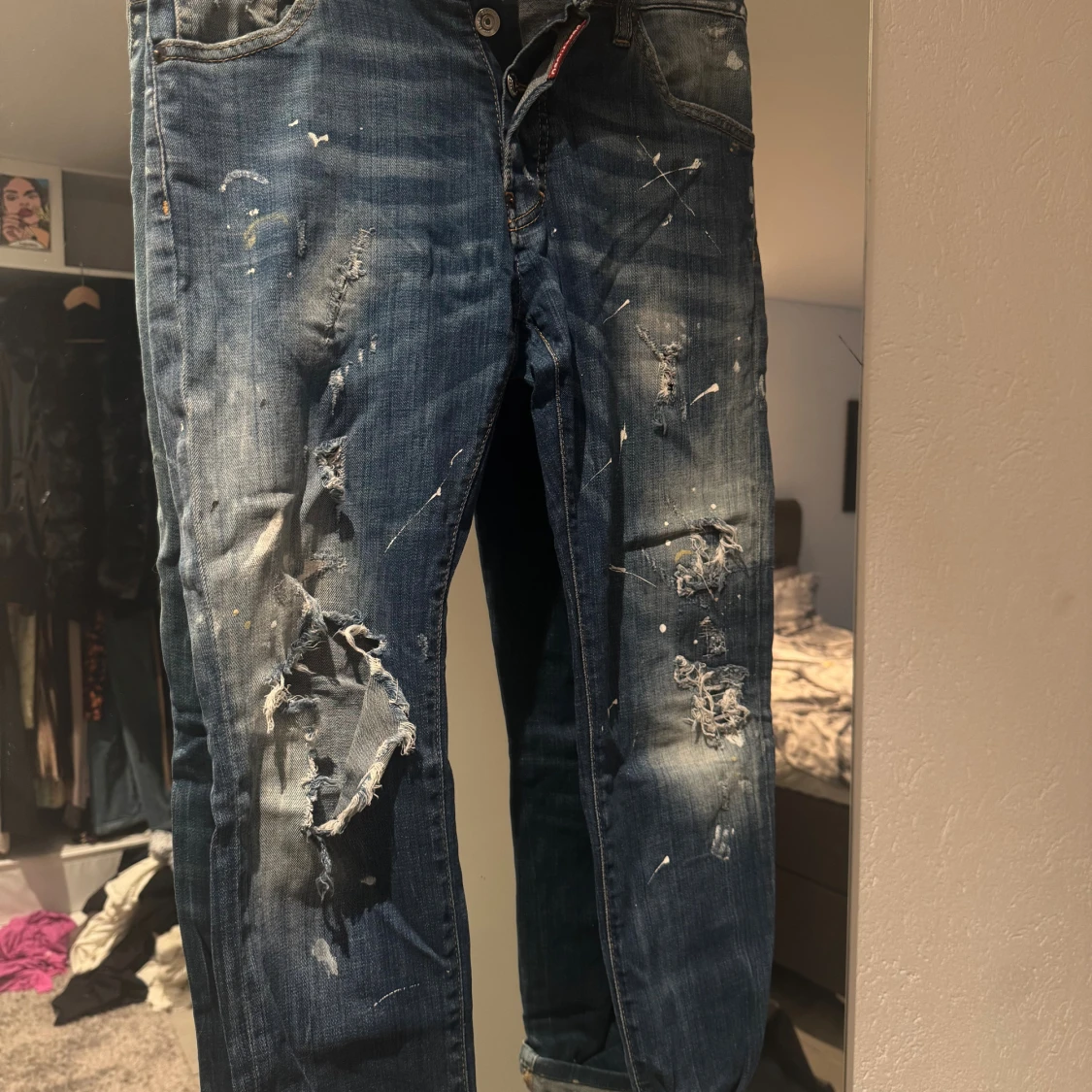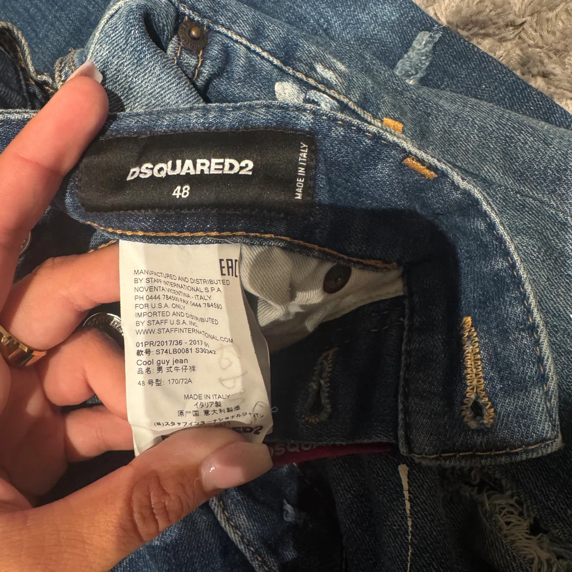 Säljer ett par Dsquared2 Cool Guy jeans i blå tvätt med slitningar, hål och färgstänk för en edgy look. Klassisk femficksmodell med knappgylf och Dsquared2-logga vid midjan.