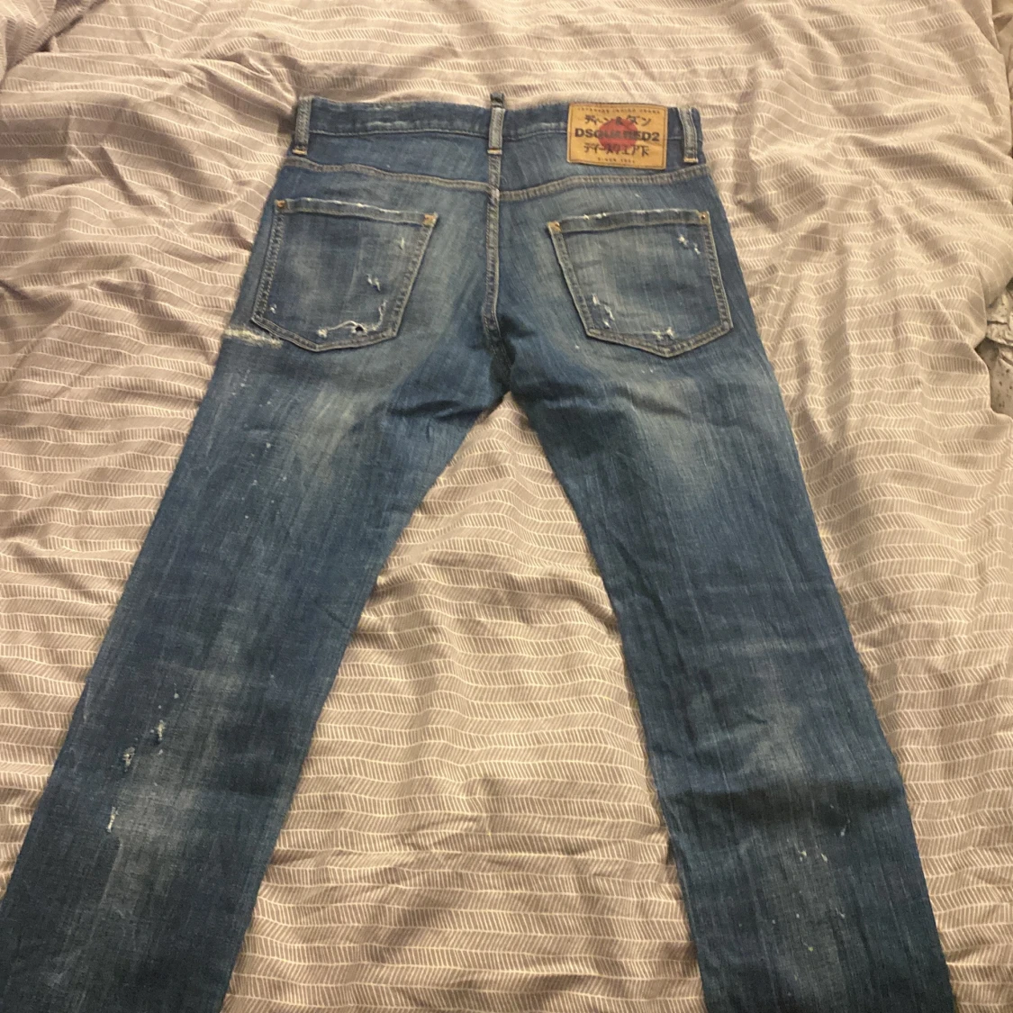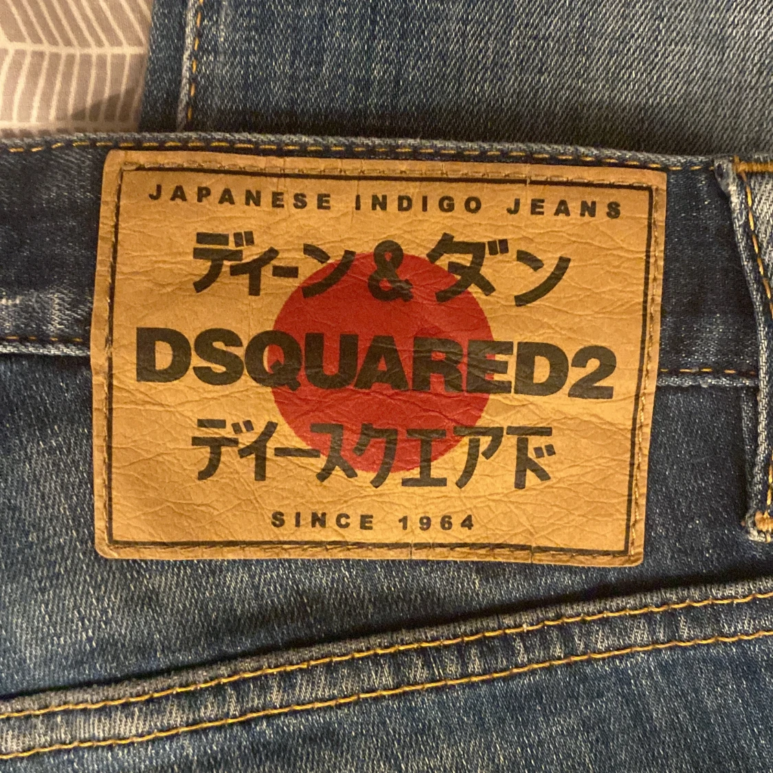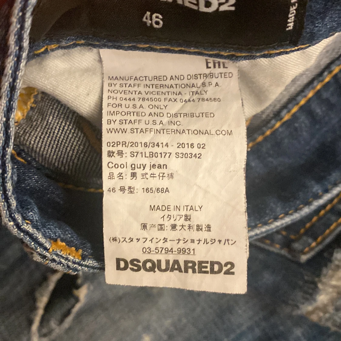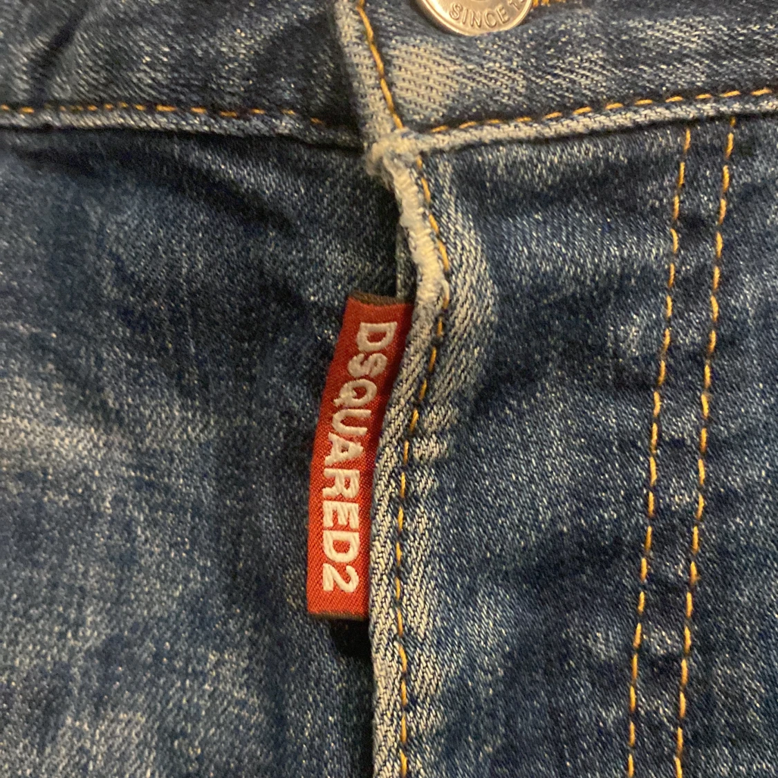 Säljer ett par Dsquared2 Cool Guy jeans i blå tvätt med slitningar och hål för en edgy look. Klassisk femficksmodell med raka ben och snygga detaljer. Jeansen är tillverkade i Italien och har Dsquared2-logga på bakfickan och röd tag vid gylfen.