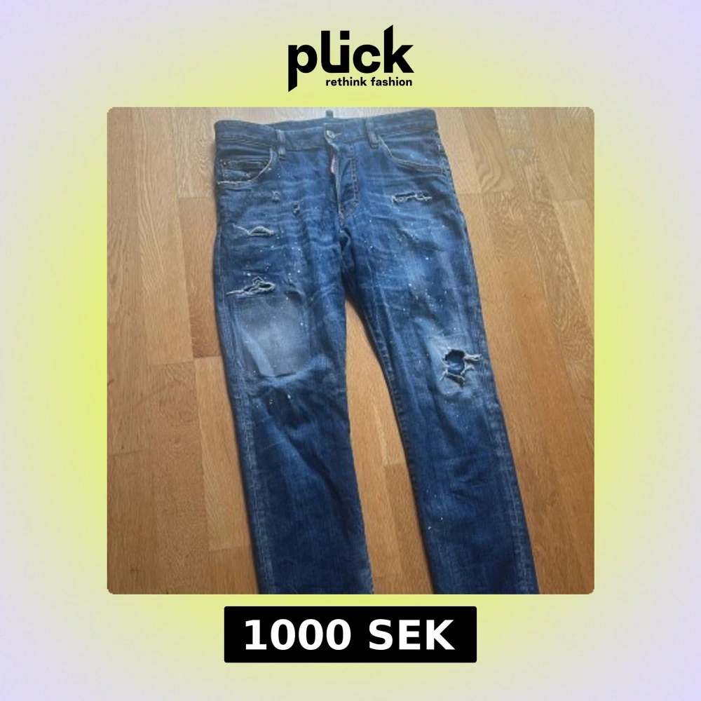 Snygga blå jeans från Dsquared2 med slitna detaljer, hål och färgstänk för en rå streetlook. Klassisk femficksmodell med rakt snitt och cool Dsquared2-lapp bak. Perfekta för dig som gillar en edgy stil. Säljes endast för att jag har växt ut (Size 30/32 EU)
