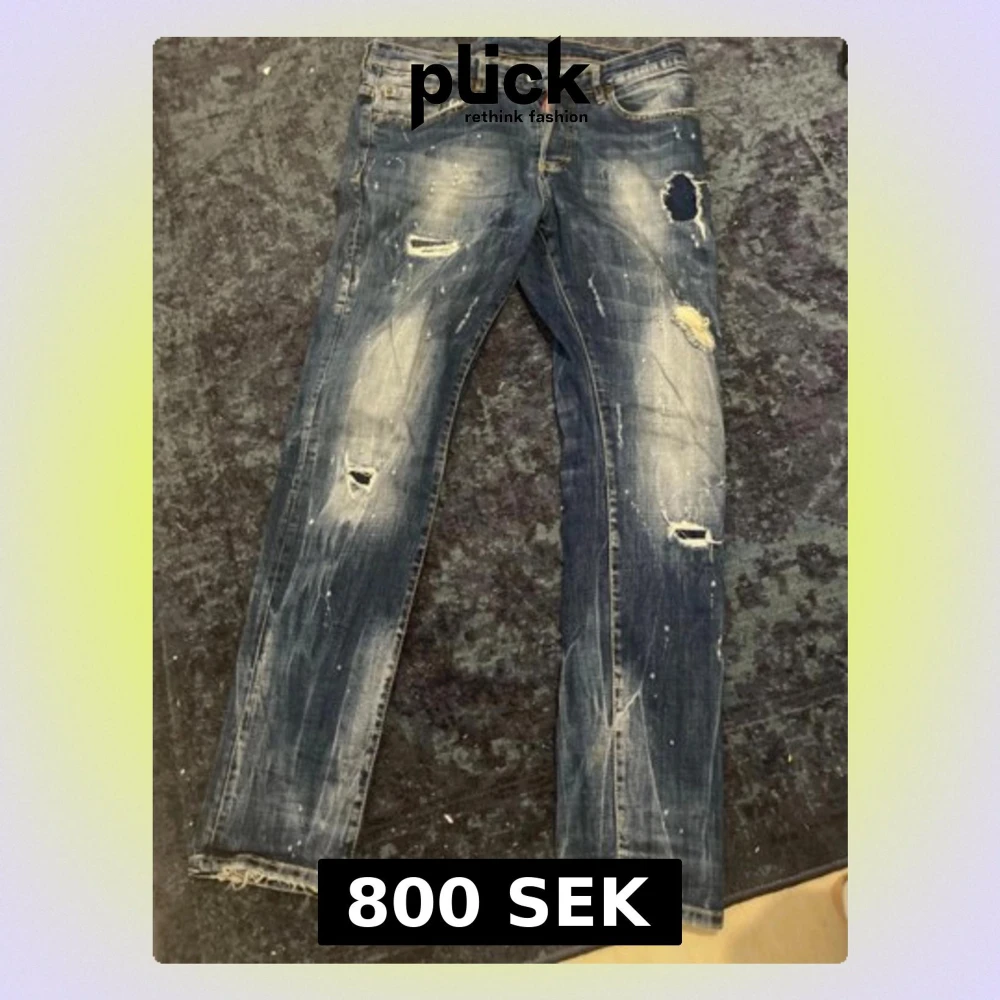 Säljer ett par blå jeans från Dsquared2 med slitna detaljer, hål och patch på låret. Jeansen har en smal passform och klassisk femficksdesign. Snygga kontrastsömmar och cool tvätt med ljusa partier. Perfekta för dig som gillar en edgy stil.