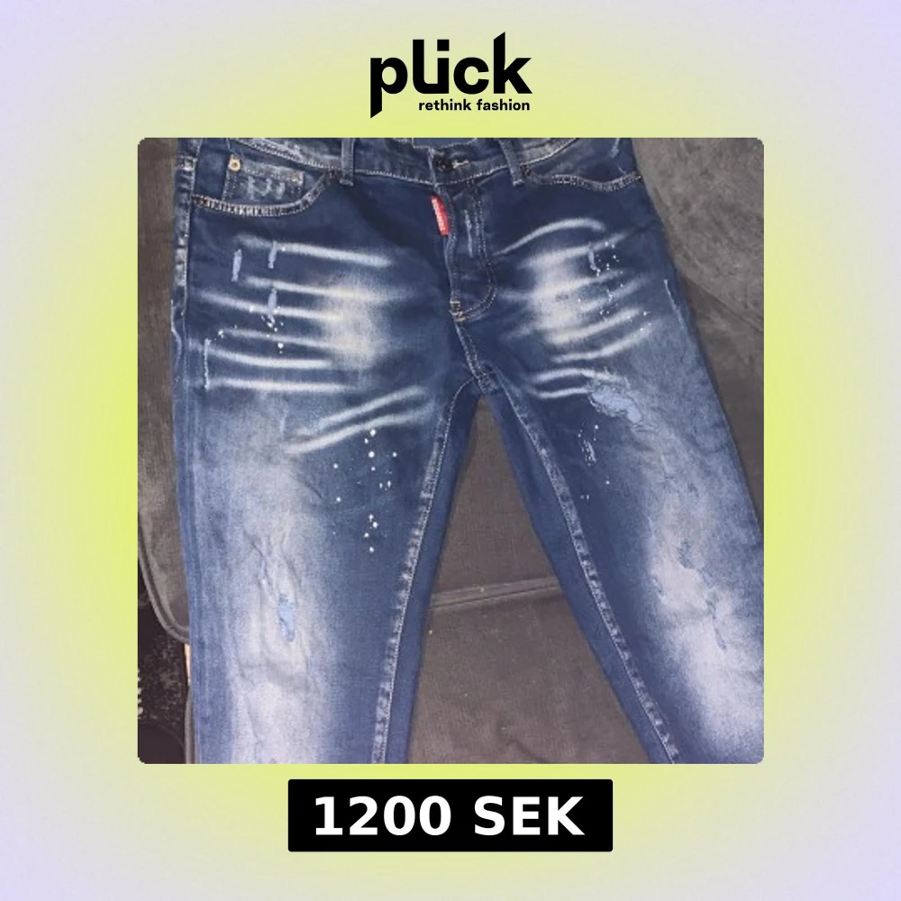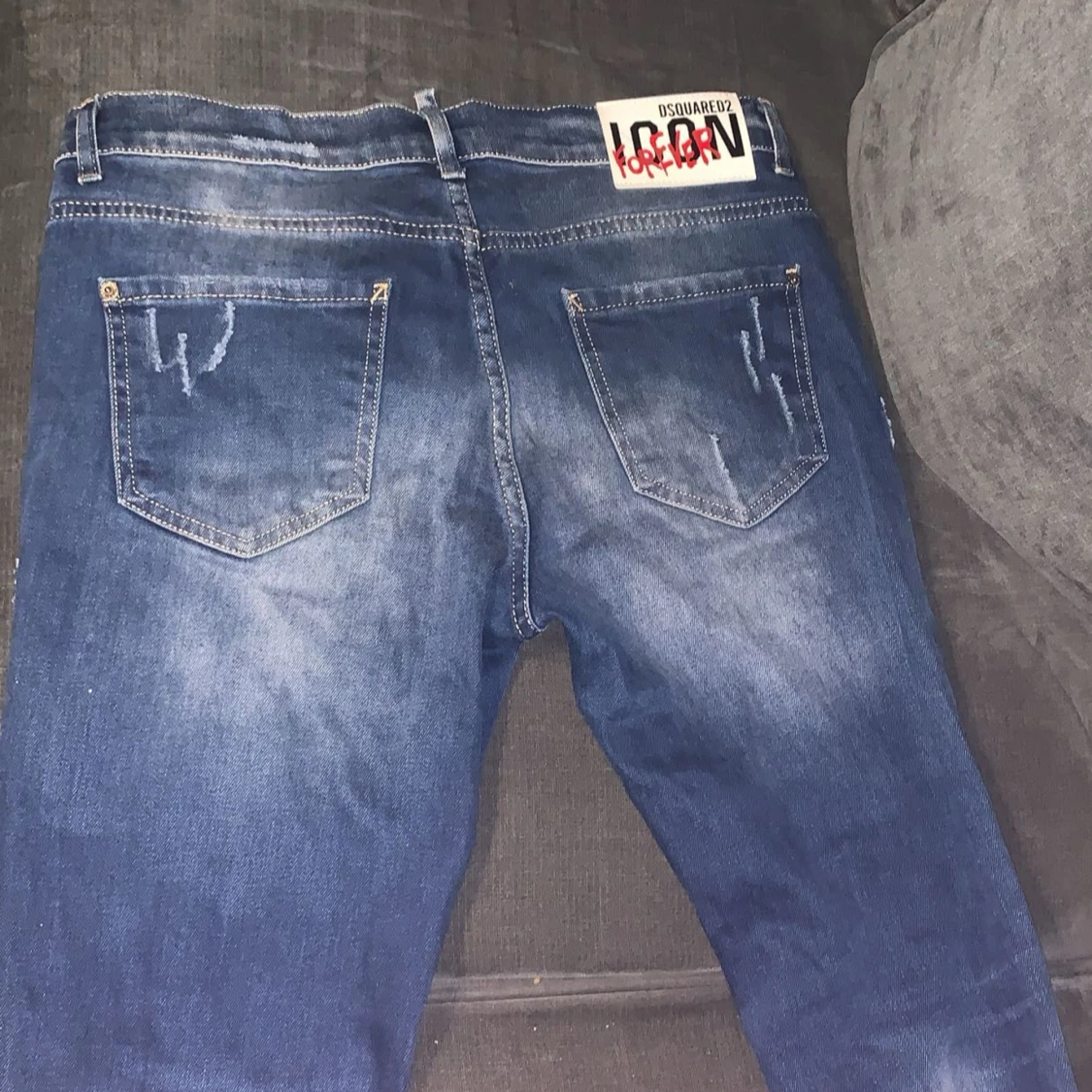 Säljer ett par blå Dsquared2 ICON jeans med coola slitningar och färgstänk på framsidan. Jeansen har en snygg tvättad look, klassiska fem fickor och en stor vit patch med röd text bak i midjan. Perfekt för dig som gillar streetstyle och vill sticka ut.