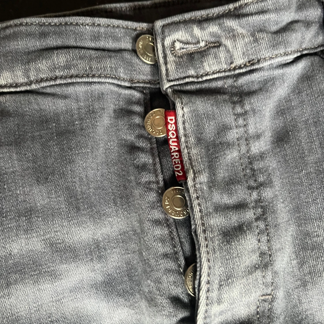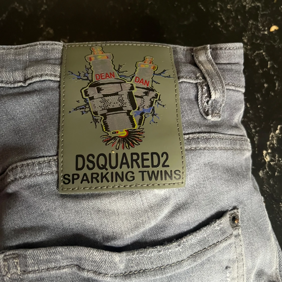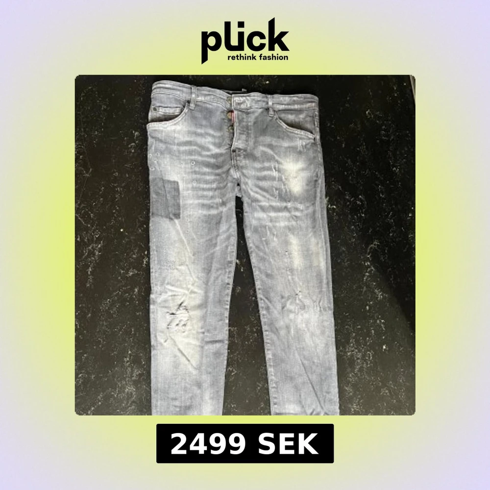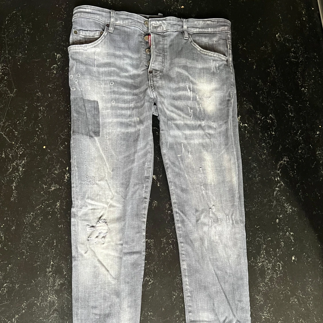 Säljer ett par grå jeans från Dsquared2 med coola slitningar och patchdetaljer. Byxorna har knappar i gylfen, klassisk femficksmodell och en stor Dsquared2-patch bak. Snyggt tvättade och med en streetig vibe. Storlek 50, M och passar S och L , skriv för mer info