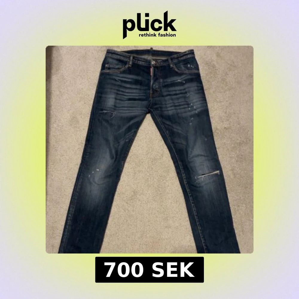 Snygga mörkblå jeans med slitna detaljer och en klassisk femficksdesign. Äkta dsquared2 jeans nyskick, säljs pga försmå. Pris går att diskuteras, hör av er om fler frågor!