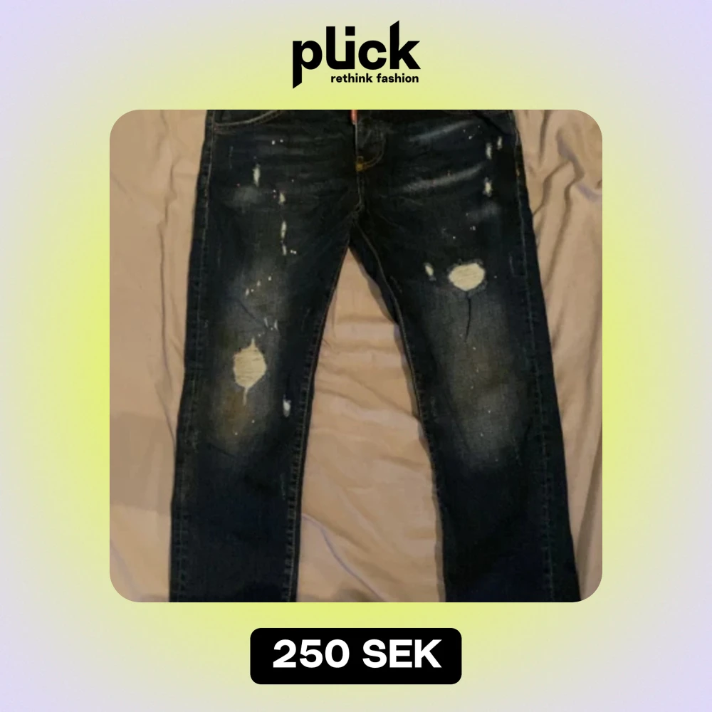 Tjena säljer ett par Dsquared2 jeans i storlek 50eu, dem har en liten smutsfläck på vänster knä men de går att få bort jag har tvättat dem men om man tar något bra medel så går de bort.