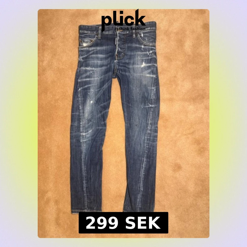 Snygga blå jeans från Dsquared2 med coola slitningar och blekta detaljer. Klassisk femficksmodell med Dsquared2-logga vid fickan och brunt läderpatch bak. Jeansen har raka ben och normal passform, tillverkade i slitstarkt denimtyg. Skick 8-10. Nypris 4499kr Mitt pris 299kr. Storlek 42