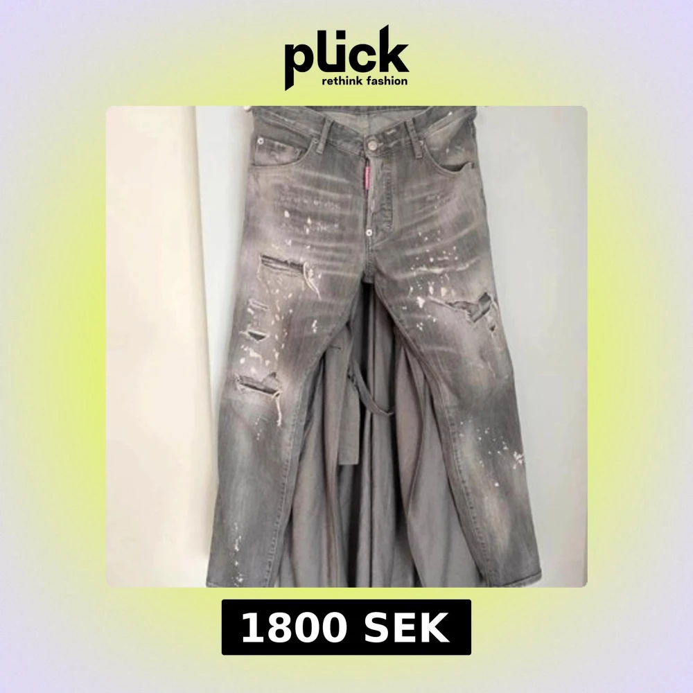 Säljer ett par grå jeans från Dsquared2 med coolt distressed utseende, slitna detaljer och vita färgstänk. Byxorna har klassisk femficksdesign, knappgylf och raka ben. Perfekta för dig som gillar en edgy och trendig stil.